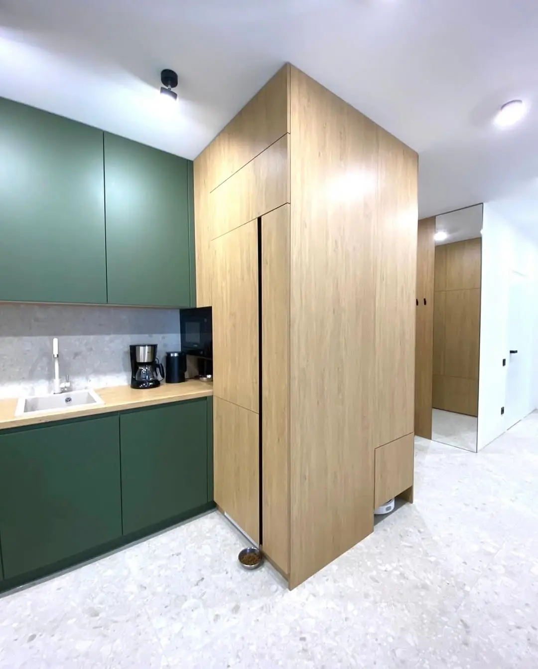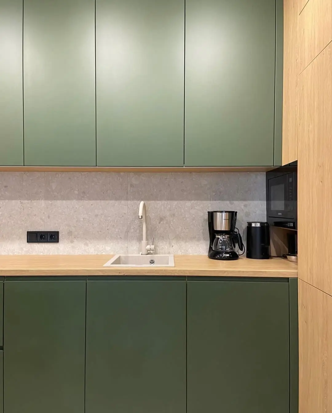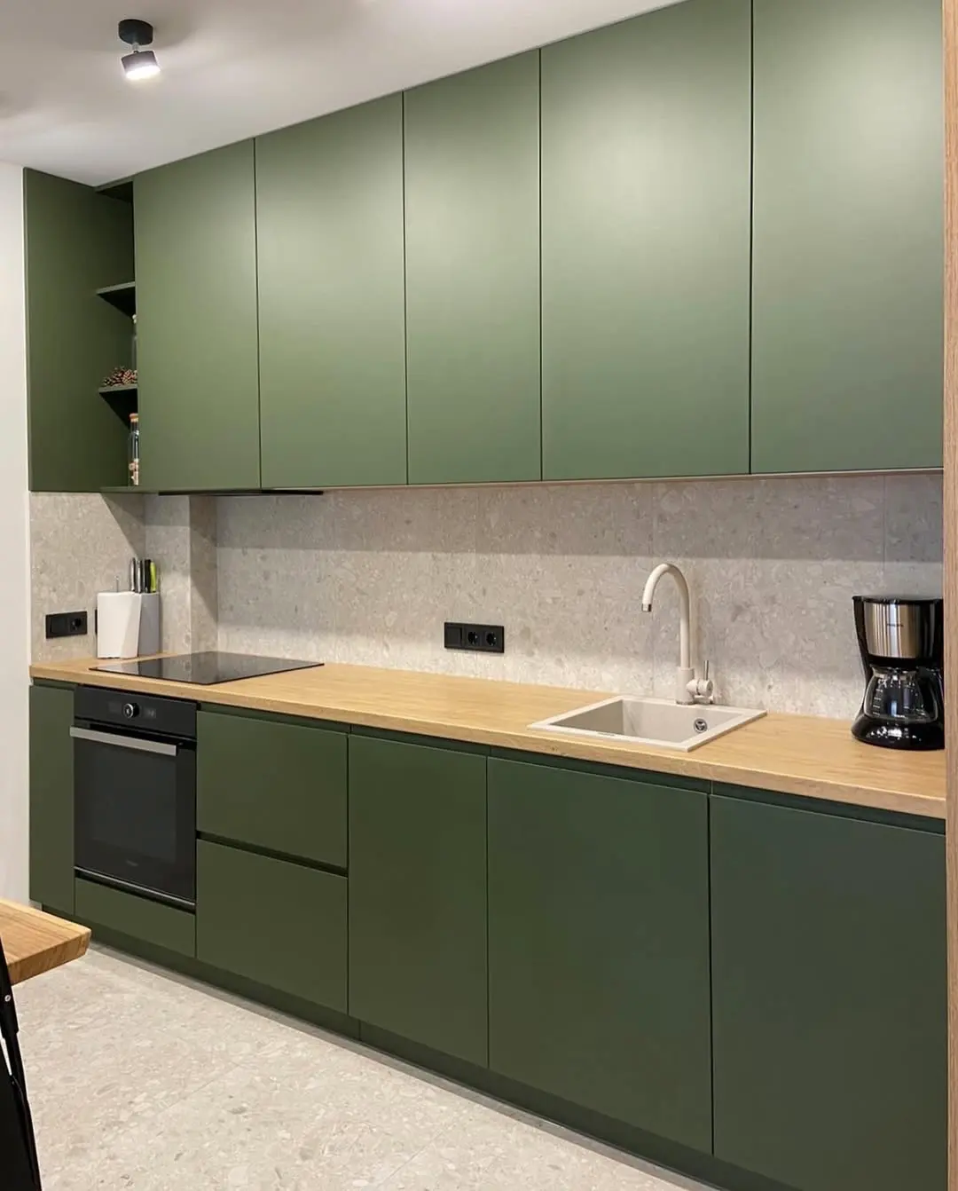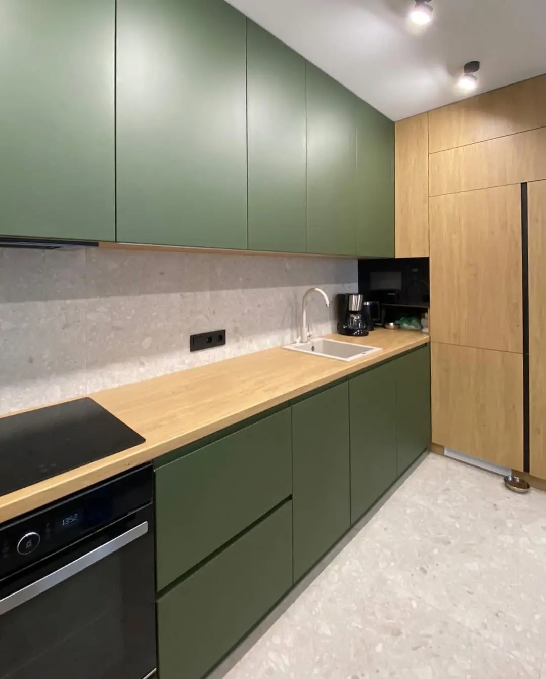 Современная прямая кухня в оливково-зеленом цвете с теплой дубовой столешницей. Лаконичные фасады без ручек создают чистый минималистичный вид, а древесные акценты вносят уют и природное тепло. Идеальное сочетание для тех, кто ценит стиль и гармонию в интерьере.