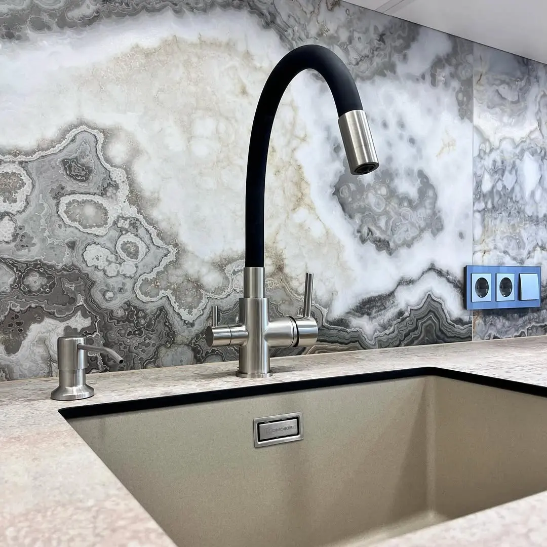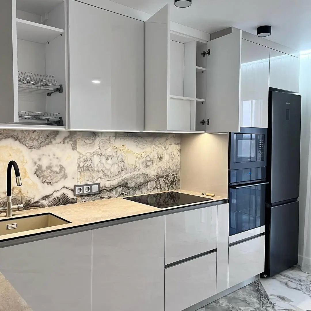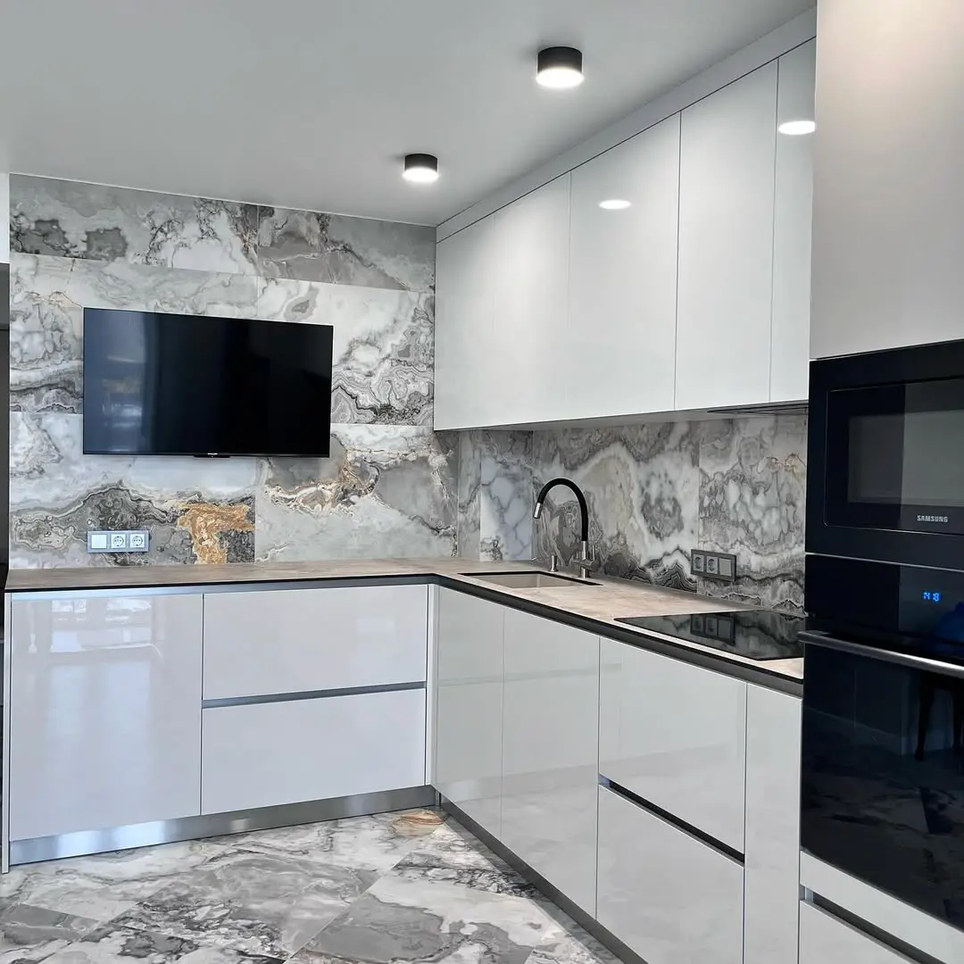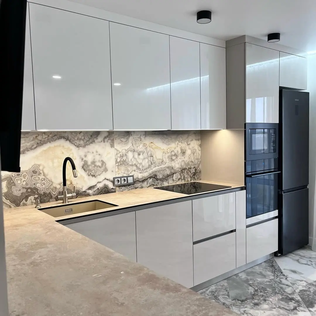 Современная угловая кухня с белыми глянцевыми фасадами и акцентным мраморным фартуком в стиле оникса. Глянцевые поверхности отражают свет, создавая ощущение простора. Контраст серого и белого с фактурой камня добавляет изысканности и премиального вида.