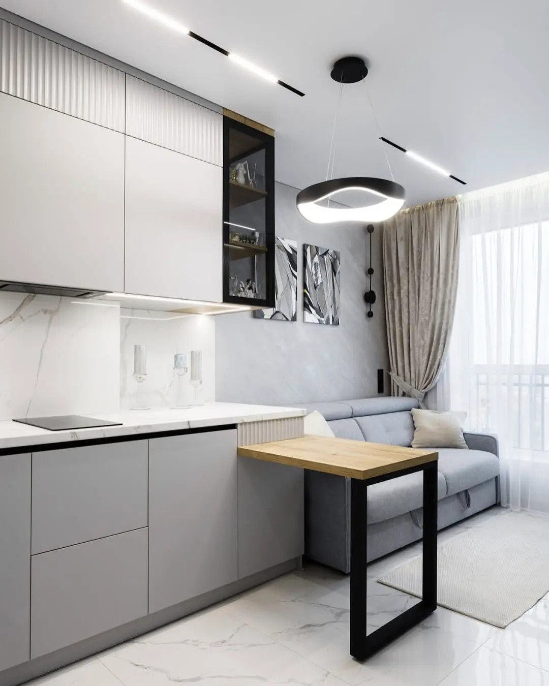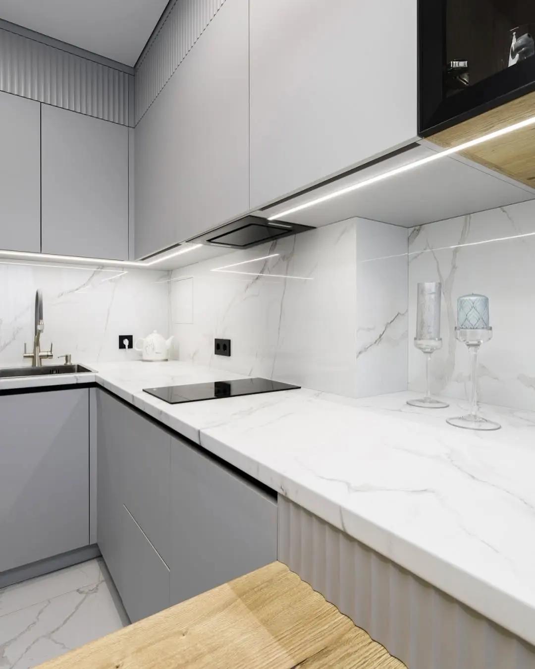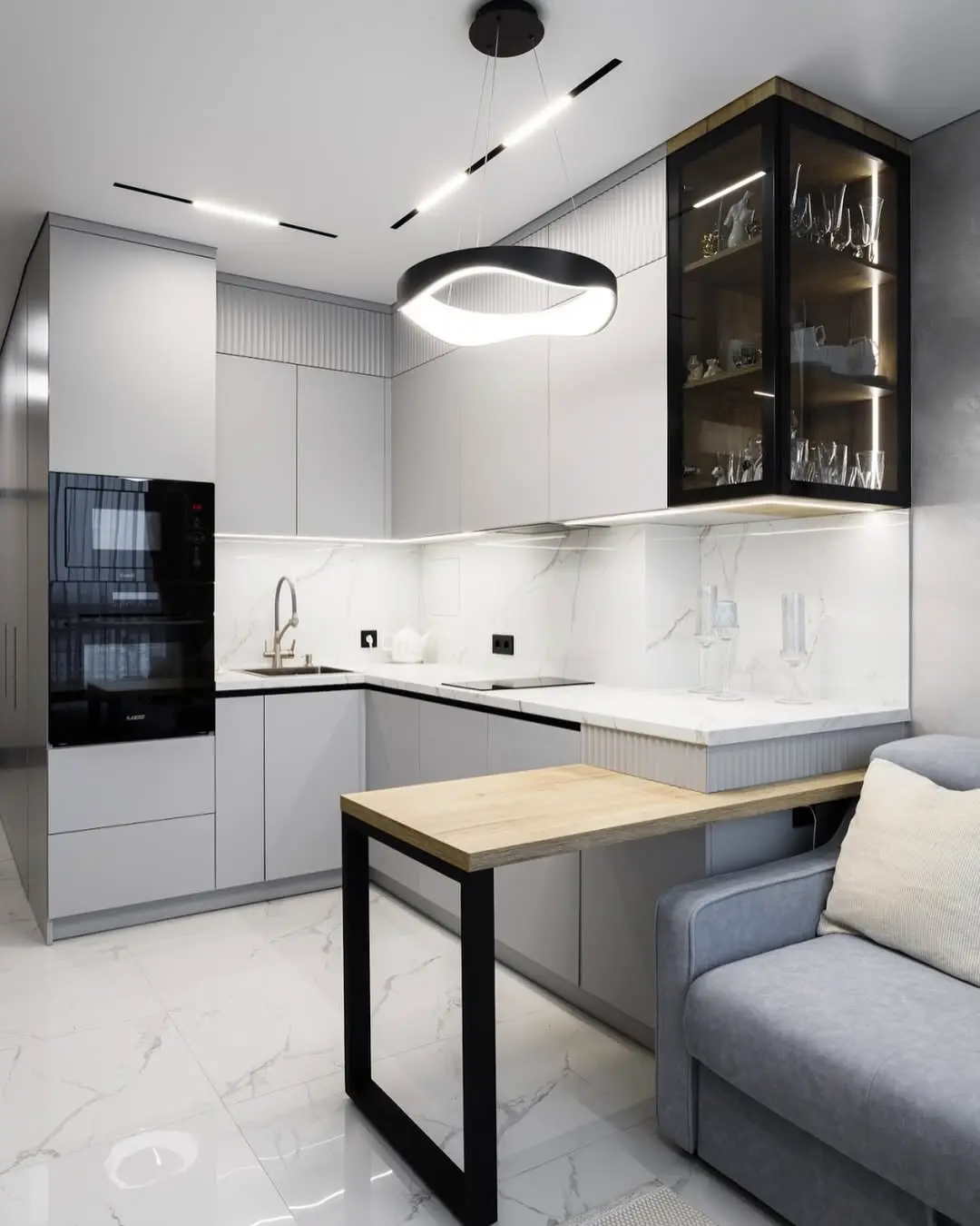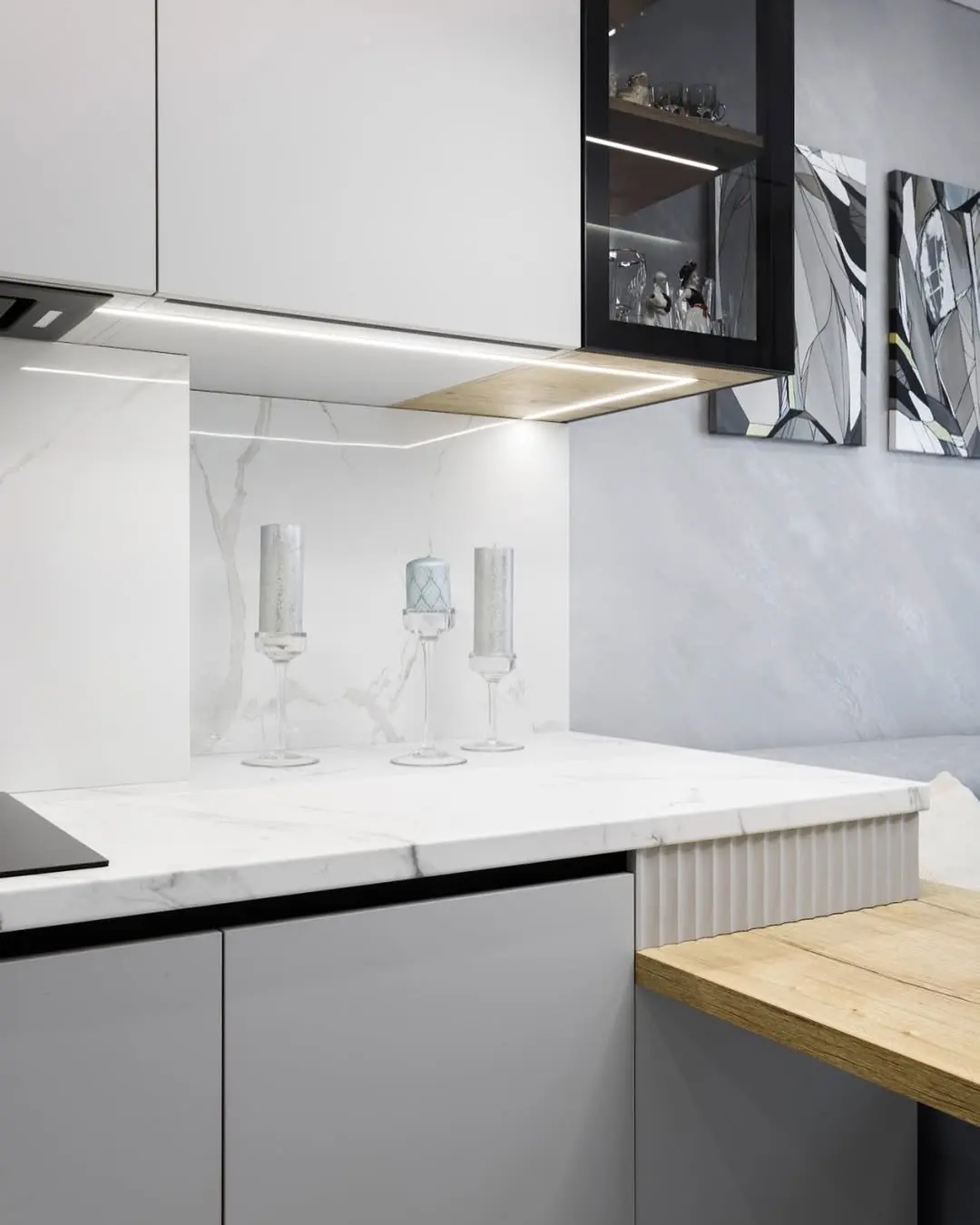 Современная угловая кухня Орион в светло-сером цвете с акцентной витриной в чёрной рамке. Столешница и фартук выполнены из искусственного камня под белый мрамор, что создаёт лёгкий и элегантный интерьер. Барная стойка из дерева делает кухню ещё более функциональной и уютной. Фурнитура Blum обеспечивает комфорт и долговечность.