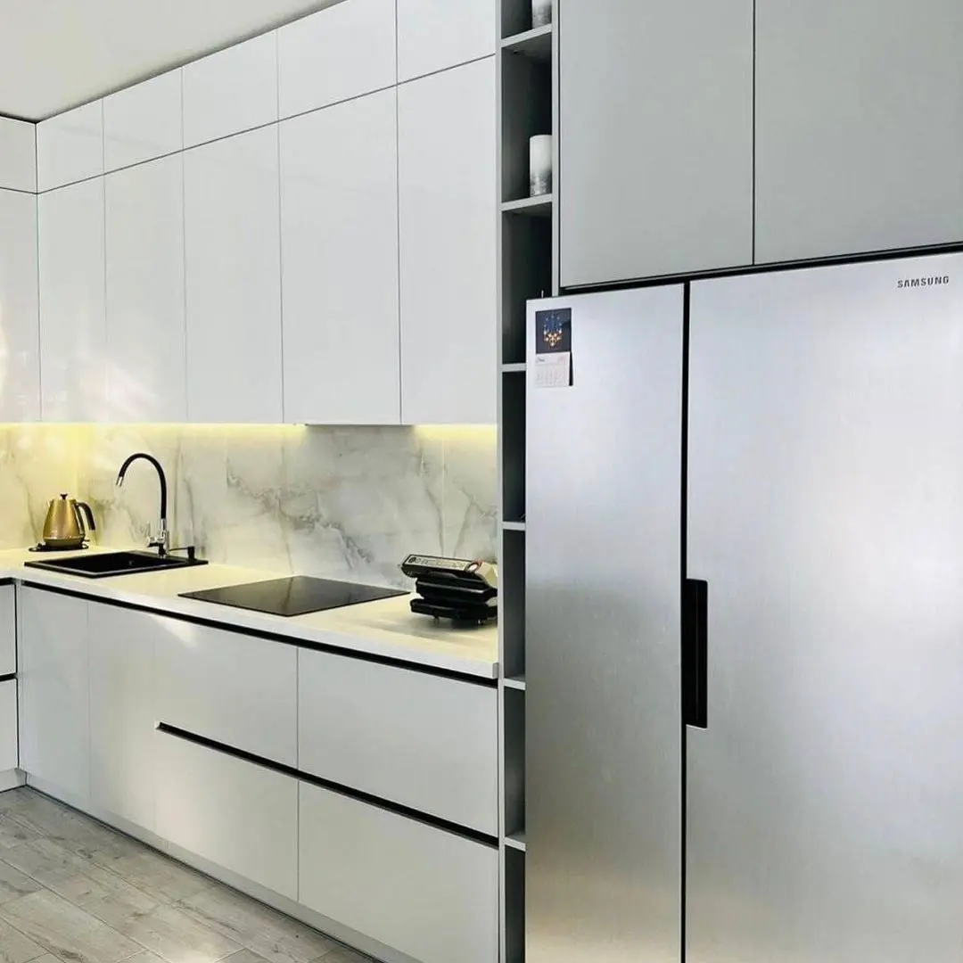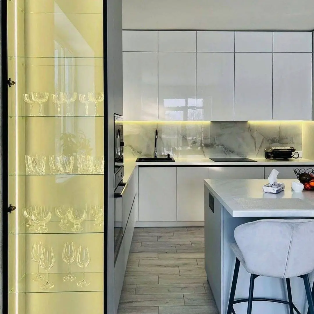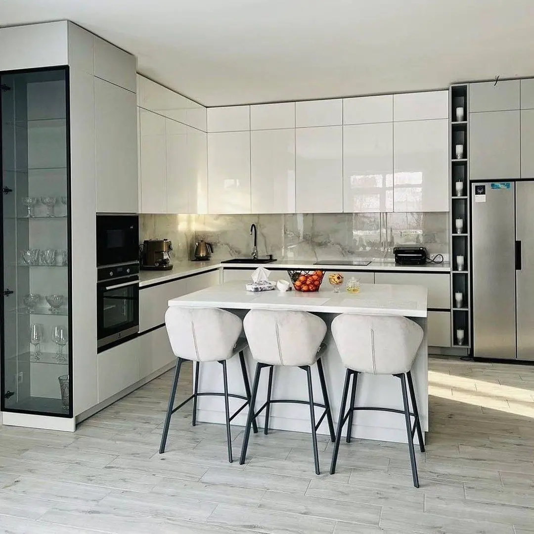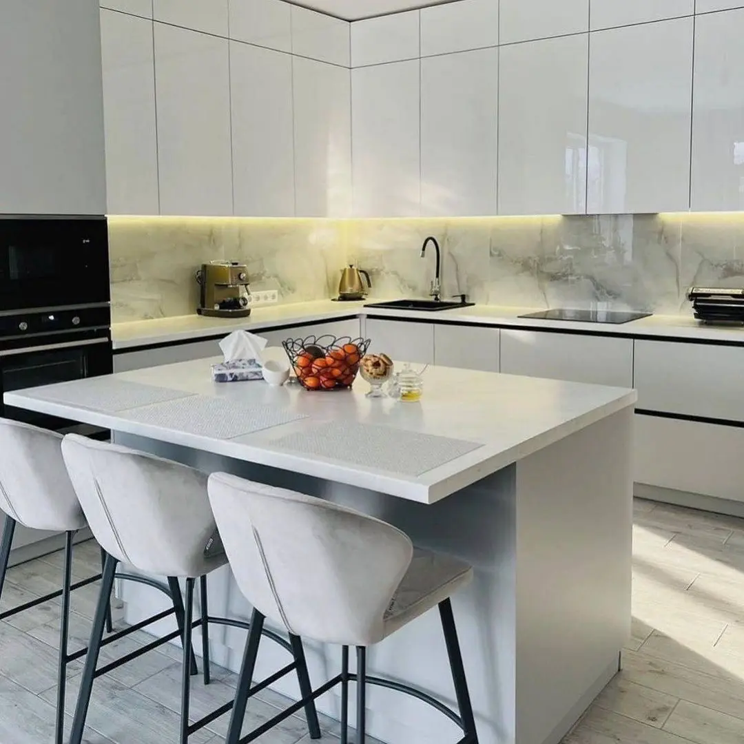 Современная белая кухня в глянцевом исполнении с удобным островом, который выполняет функцию дополнительной рабочей поверхности и барной стойки. Белые фасады из МДФ в плёнке ПВХ подчёркивают чистоту и лёгкость интерьера, а вставки серого цвета добавляют контраста. Столешница из искусственного камня делает кухню практичной и долговечной. Фурнитура Blum обеспечивает плавное и надёжное открывание.