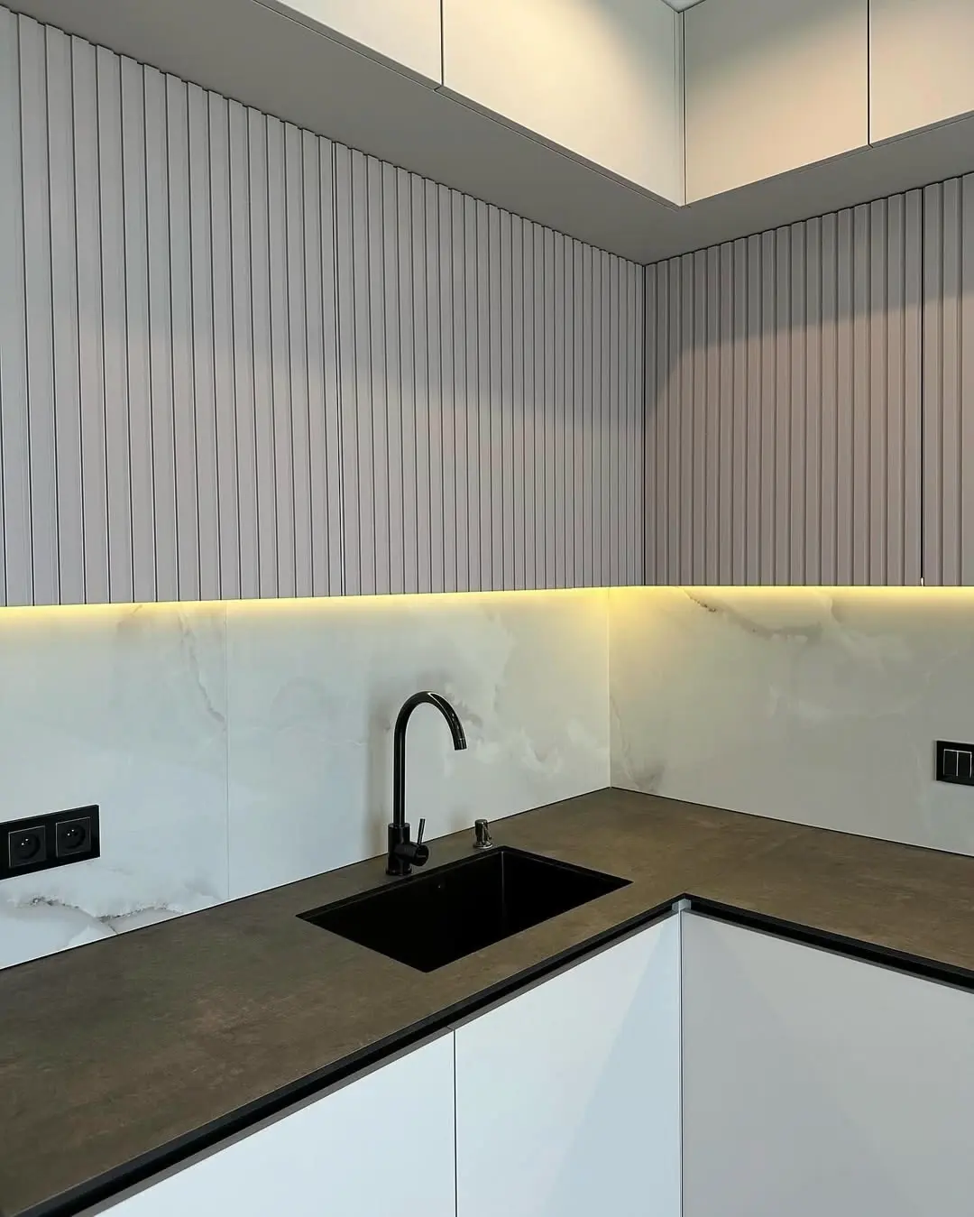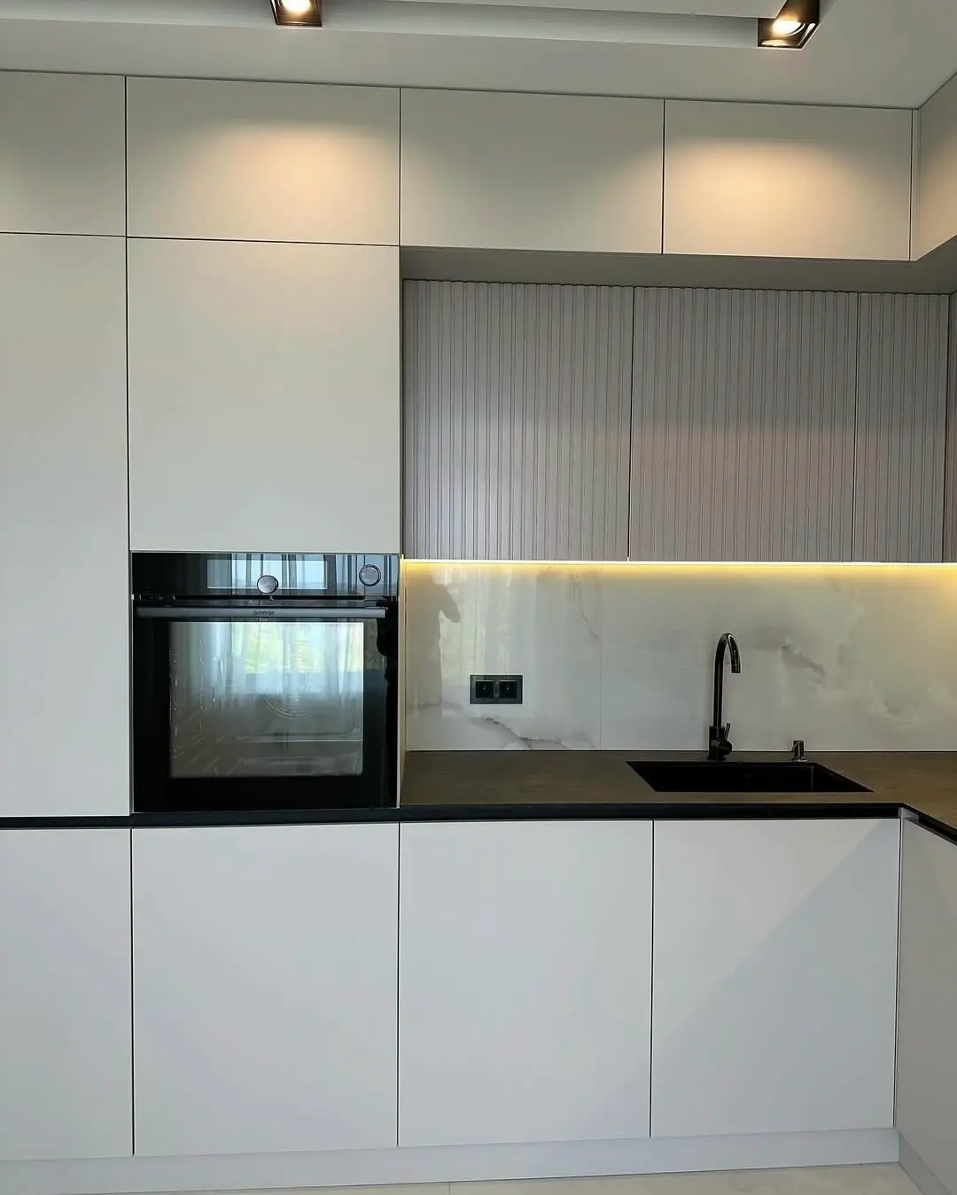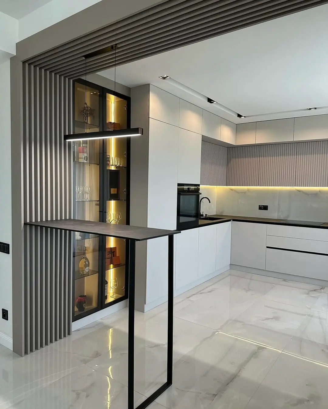 Угловая кухня в стиле лофт с фасадами из МДФ в плёнке ПВХ. Белый цвет фасадов гармонично сочетается с серыми декоративными элементами и барной стойкой. Столешница из искусственного камня и качественная фурнитура Blum обеспечивают практичность и долговечность. Встроенные шкафы со стеклянными дверцами и подсветкой придают кухне современный и уютный вид.