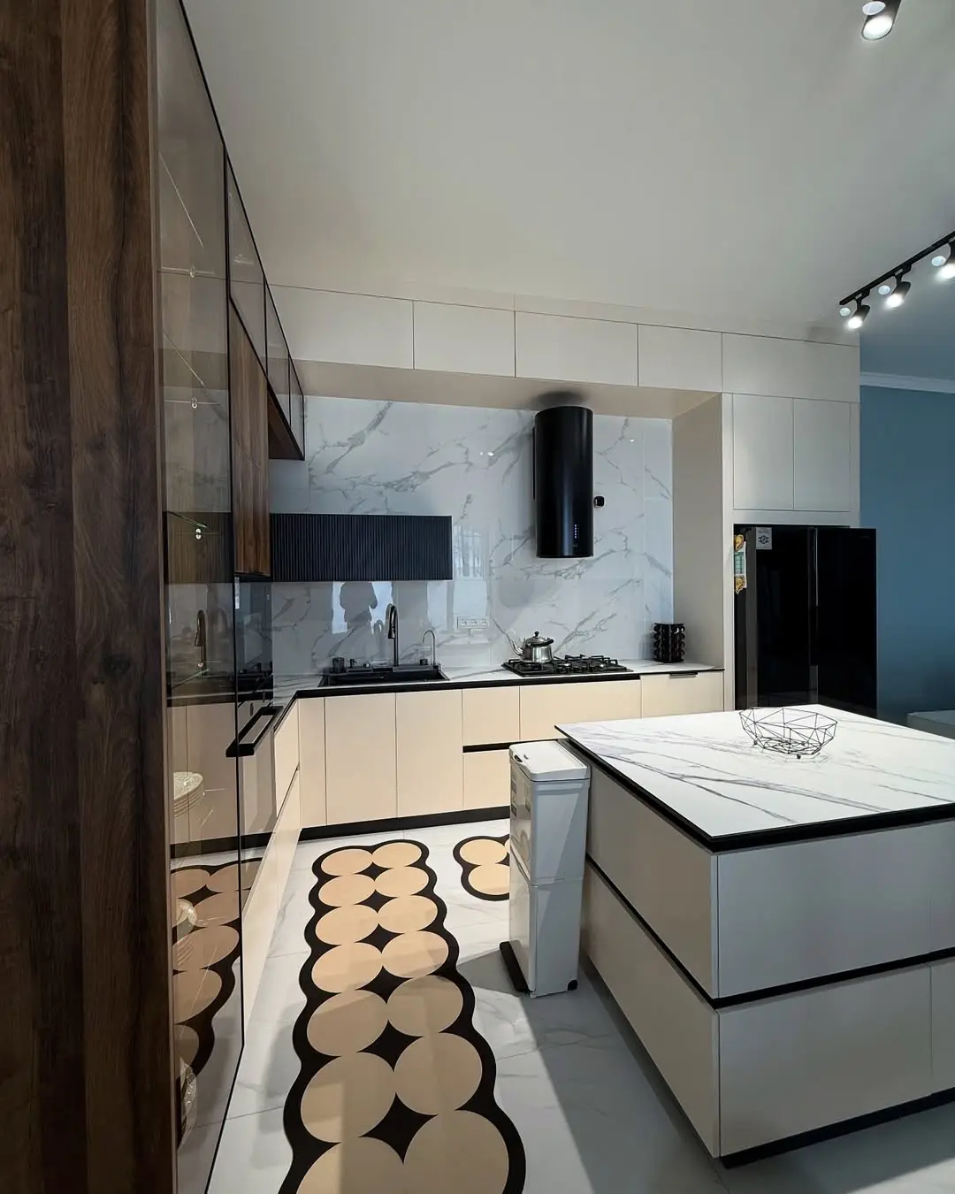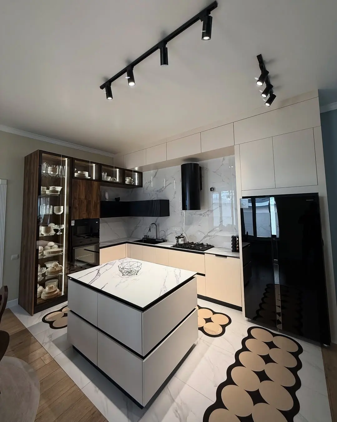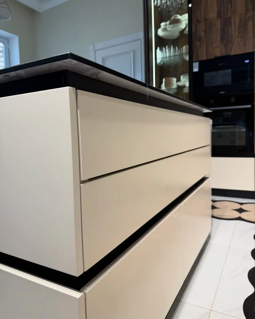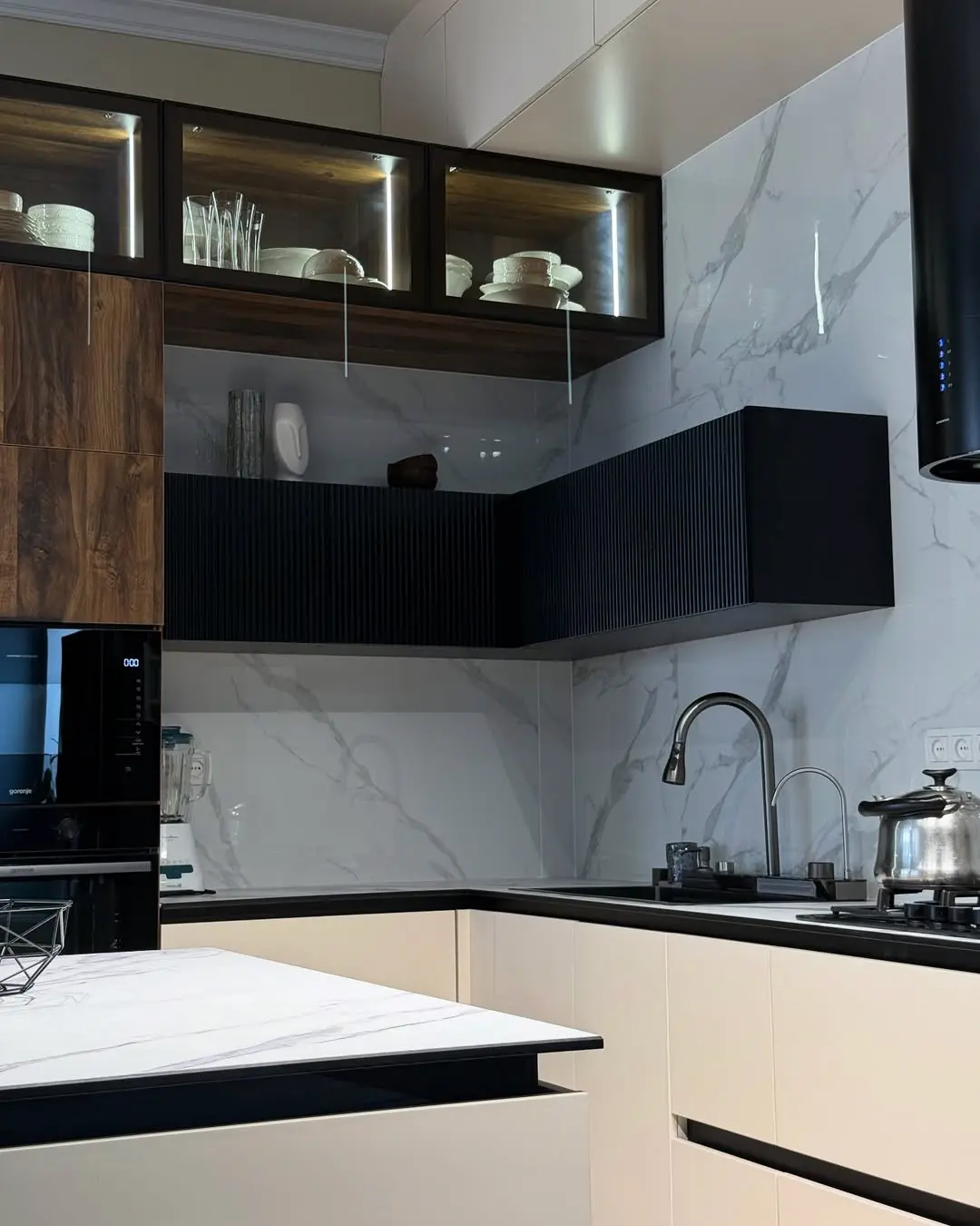 Кухня Премио — воплощение функциональности и элегантности в современном стиле. Матовые белые фасады сочетаются с чёрными акцентами и элементами под натуральное дерево, создавая эффектный контраст. Остров с мраморной столешницей становится центральным элементом пространства, объединяя рабочую и обеденную зоны. Витрина с подсветкой придаёт интерьеру премиальность, а встроенная техника и фурнитура Blum обеспечивают удобство и надёжность в использовании.