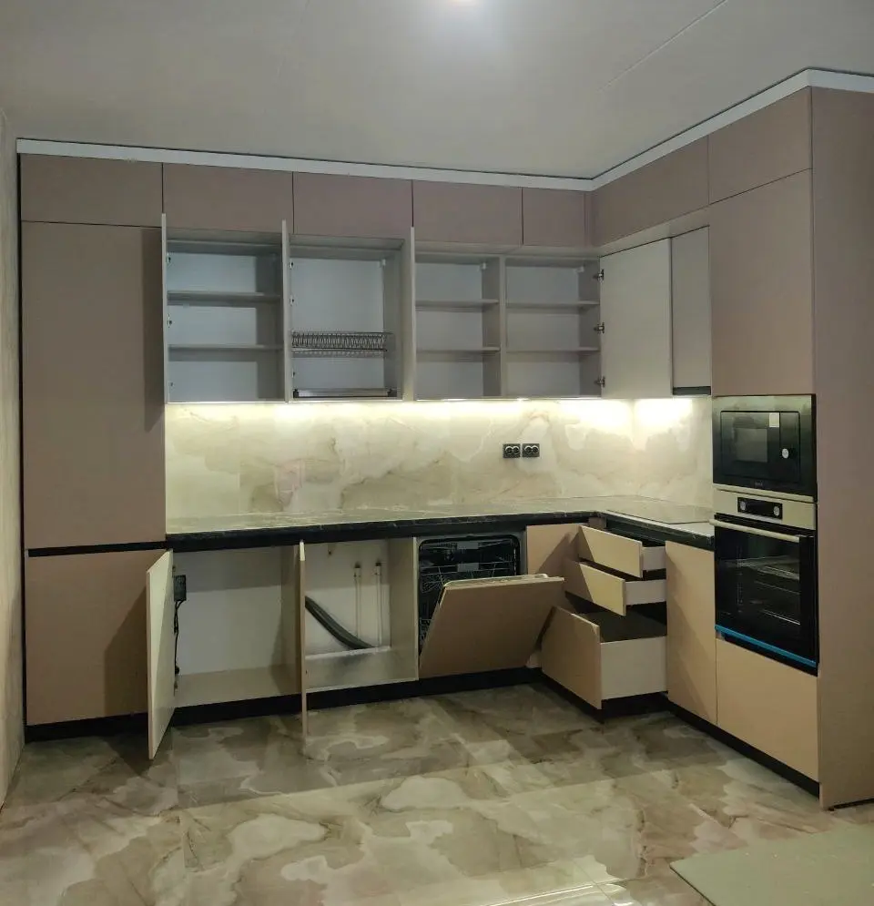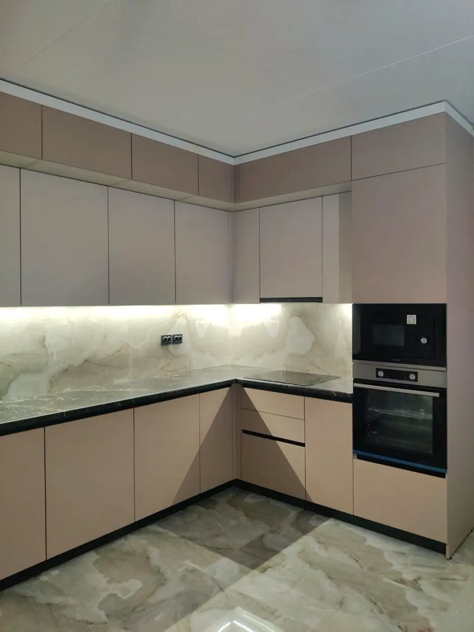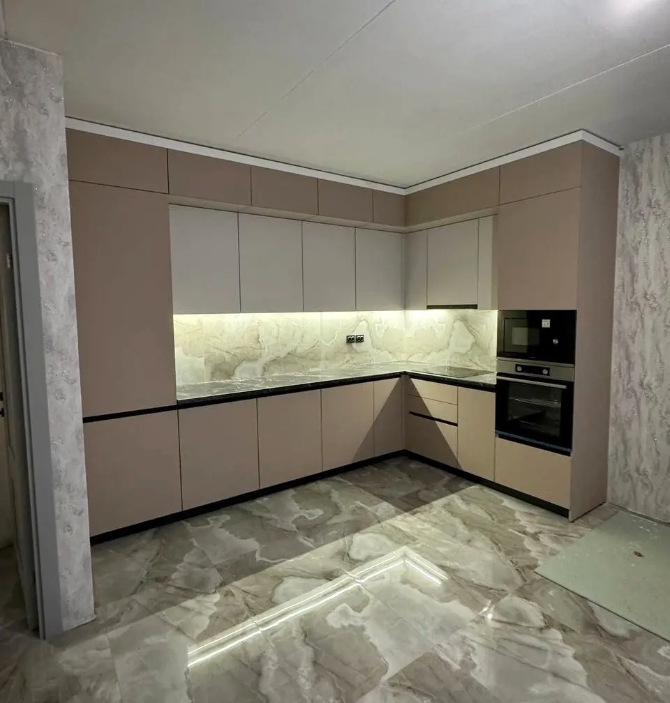 Угловая кухня с фасадами из МДФ в матовой бежевой плёнке и серыми вставками в верхних модулях. Светлый каменный фартук с мягким мраморным узором плавно сочетается с глянцевым напольным покрытием, создавая атмосферу уюта и лёгкой роскоши. Минималистичный дизайн без лишних деталей и качественная фурнитура Boyard делают кухню одновременно практичной и стильной.