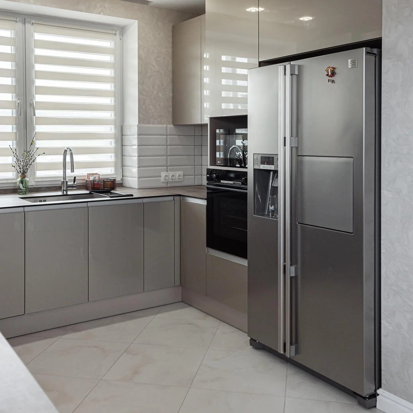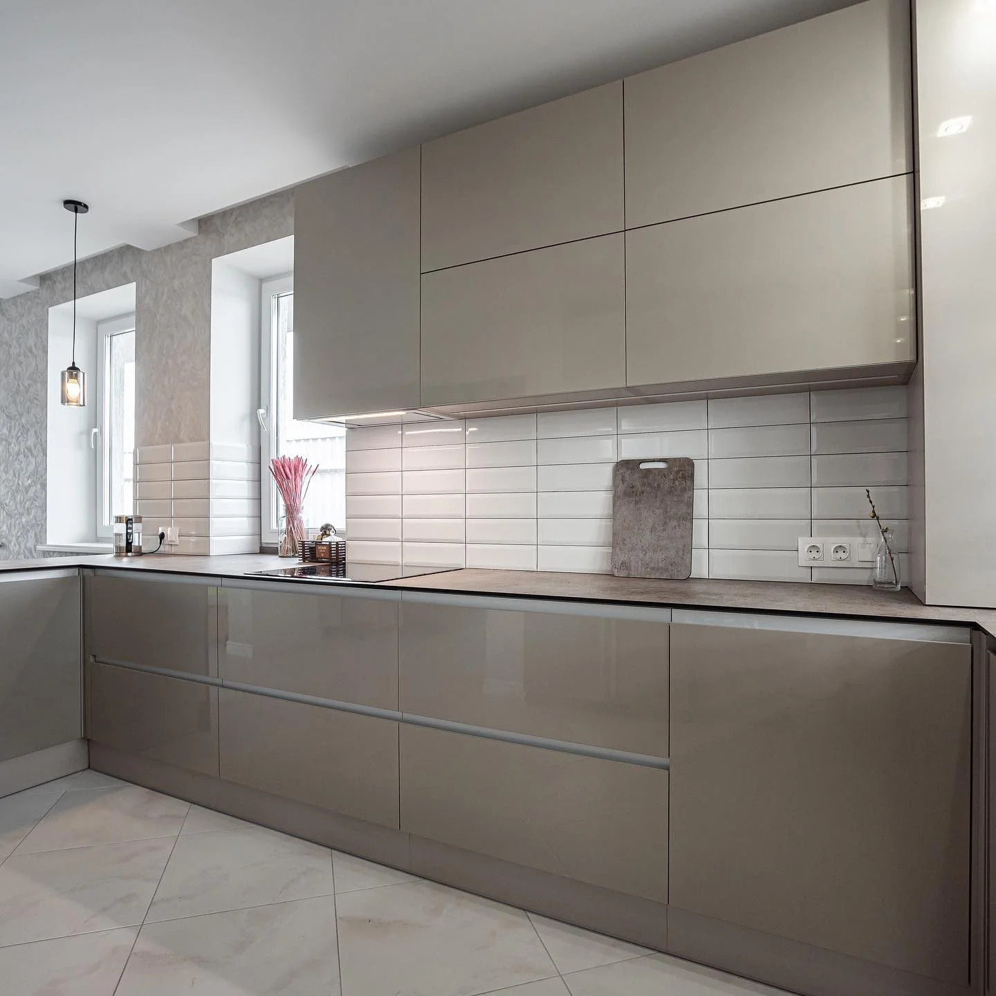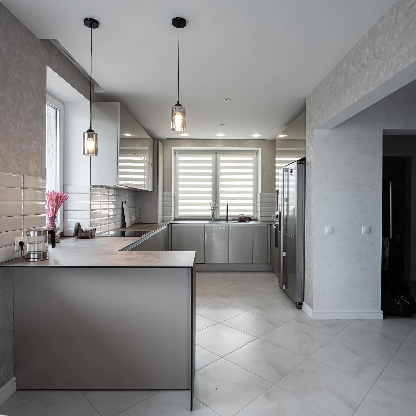 Элегантная П-образная кухня с глянцевыми серыми фасадами создает ощущение простора и света. Белый фартук «кабанчик» добавляет легкости и гармонии, а светлая каменная столешница подчеркивает современный стиль. Благодаря продуманной планировке, кухня удобна для готовки и приема гостей.