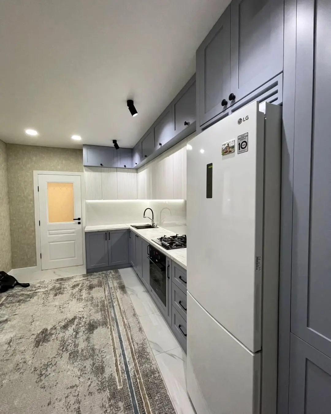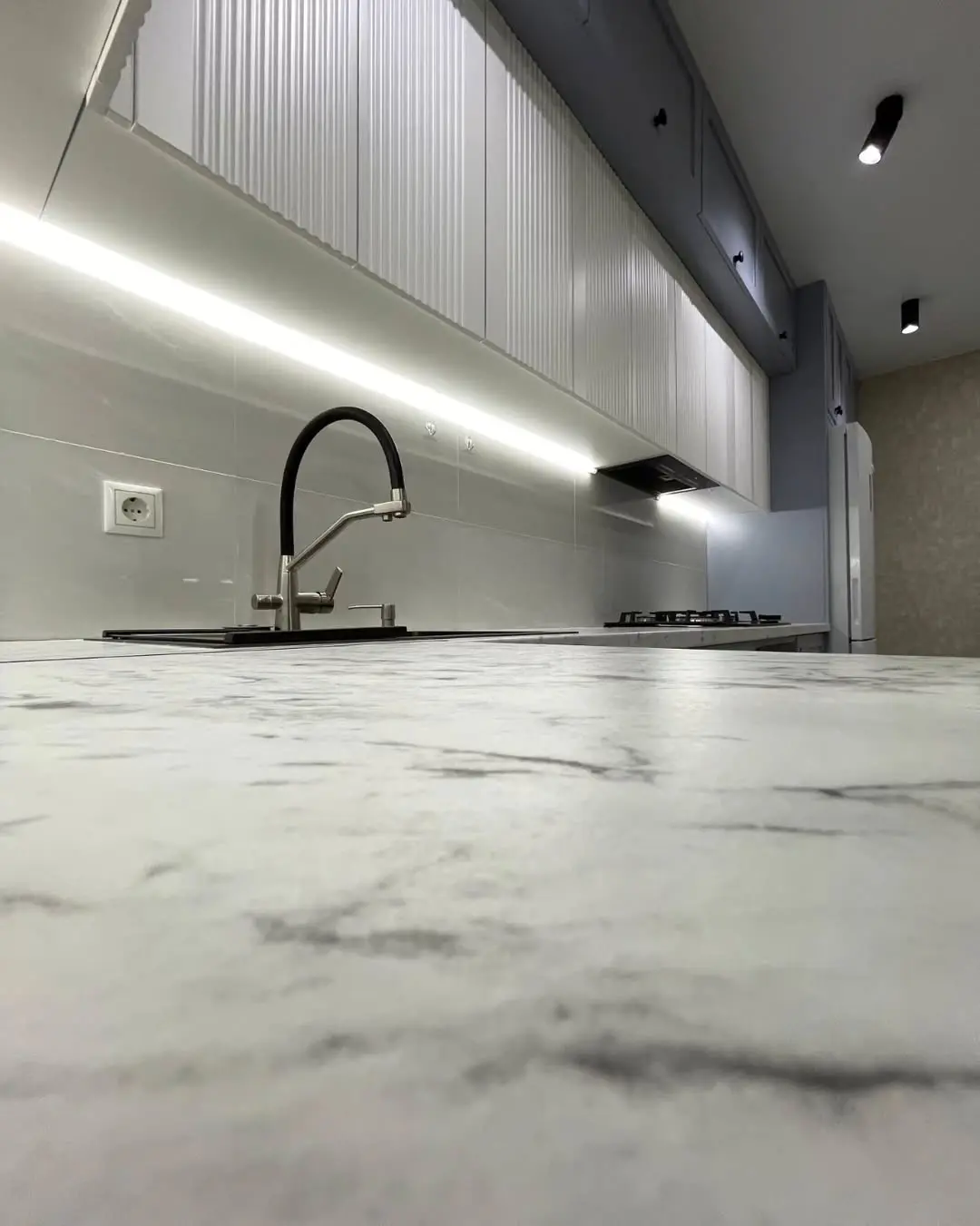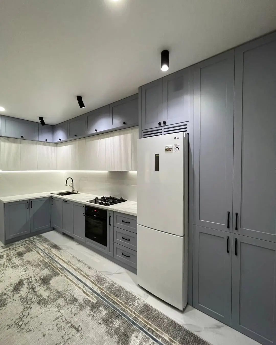 Кухня Сиена выполнена в современном стиле с элементами неоклассики. Матовые серые фасады в сочетании с белыми верхними модулями создают гармоничный контраст. Вертикальные вставки добавляют интерьеру ритмичности и утончённости. Белая столешница и фартук под мрамор подчеркивают изысканность кухни, а угловая планировка обеспечивает удобство и функциональность. Фурнитура Firmax делает использование комфортным и долговечным.