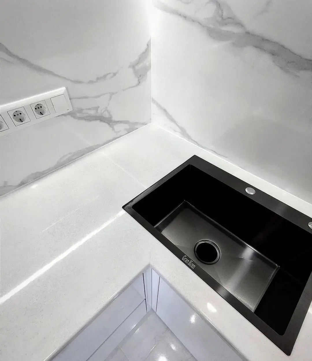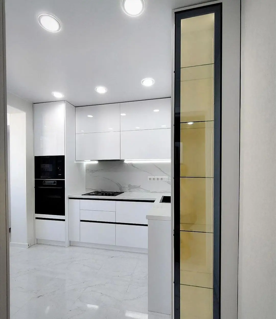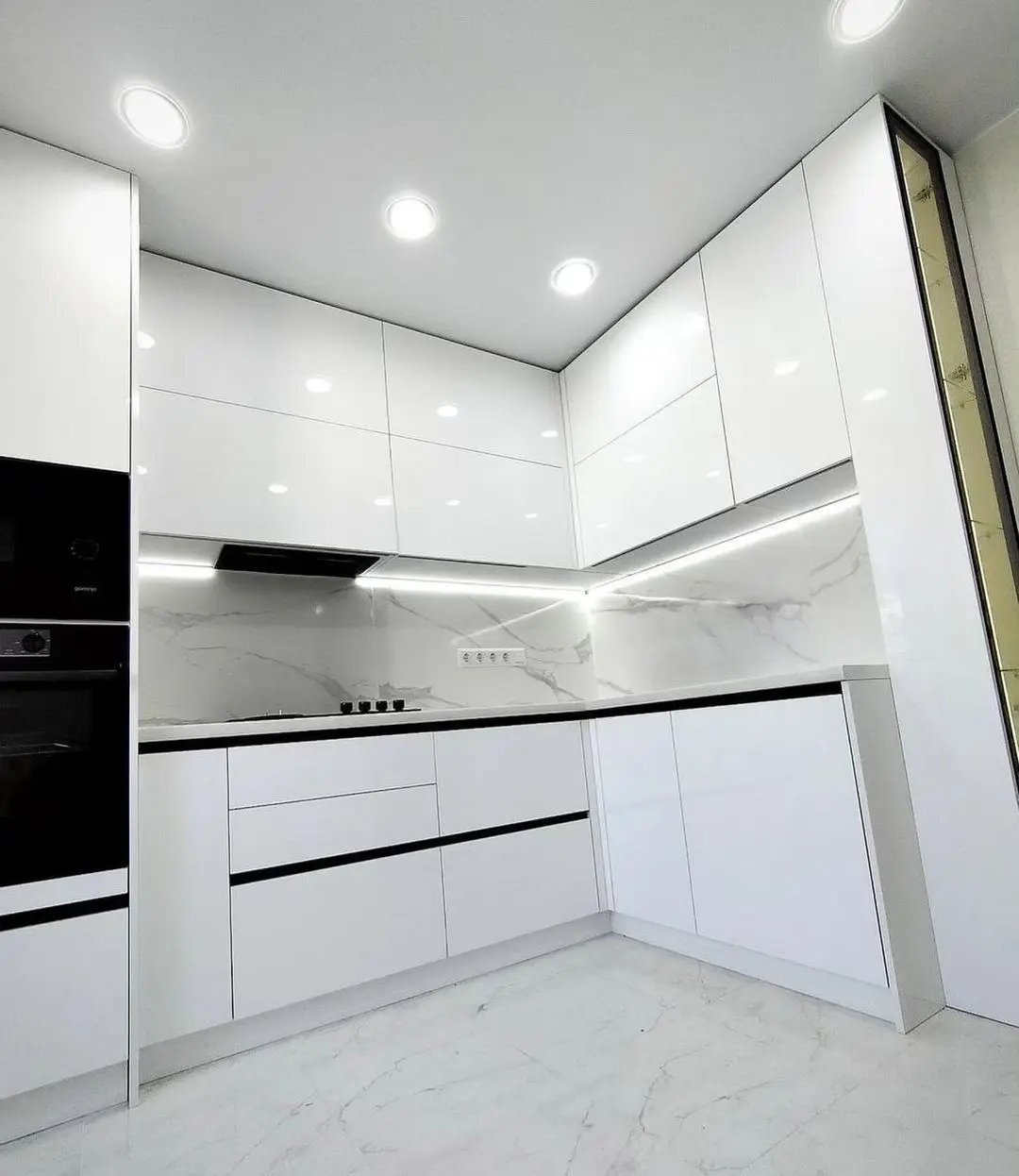 Белая глянцевая угловая кухня в современном стиле. Фасады из МДФ в плёнке ПВХ отражают свет и визуально увеличивают пространство, делая кухню ещё светлее и просторнее. Чёрные акценты в виде встроенной техники и ручек-профилей создают эффектный контраст. Столешница и фартук из искусственного камня добавляют изысканности и практичности, а качественная фурнитура Boyard гарантирует долговечность и удобство в использовании.