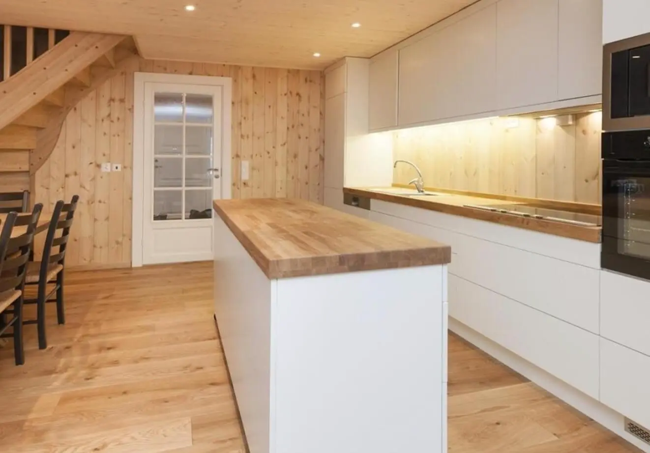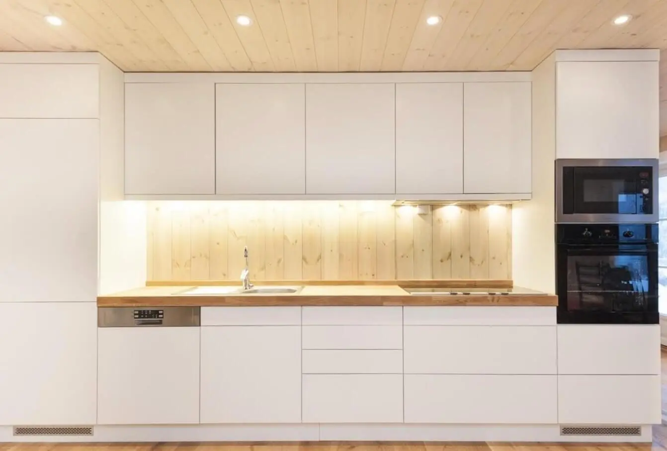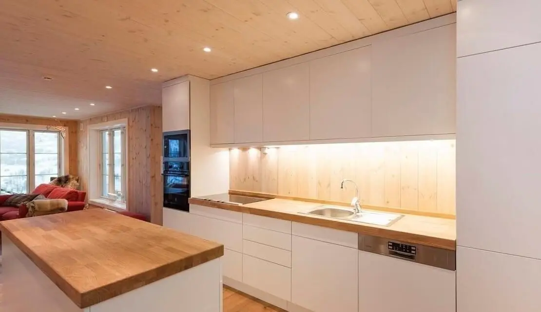 Прямая кухня с островом в скандинавском стиле. Белые фасады из МДФ в плёнке ПВХ и деревянная столешница создают атмосферу уюта и тепла. Светлый фартук из натурального дерева и встроенная техника подчёркивают современный и экологичный дизайн. Фурнитура Boyard гарантирует долговечность и удобство в использовании.