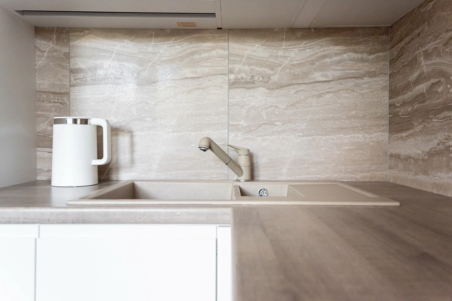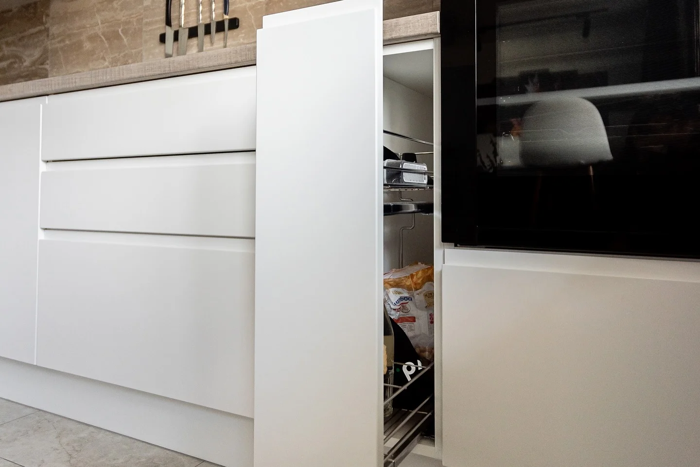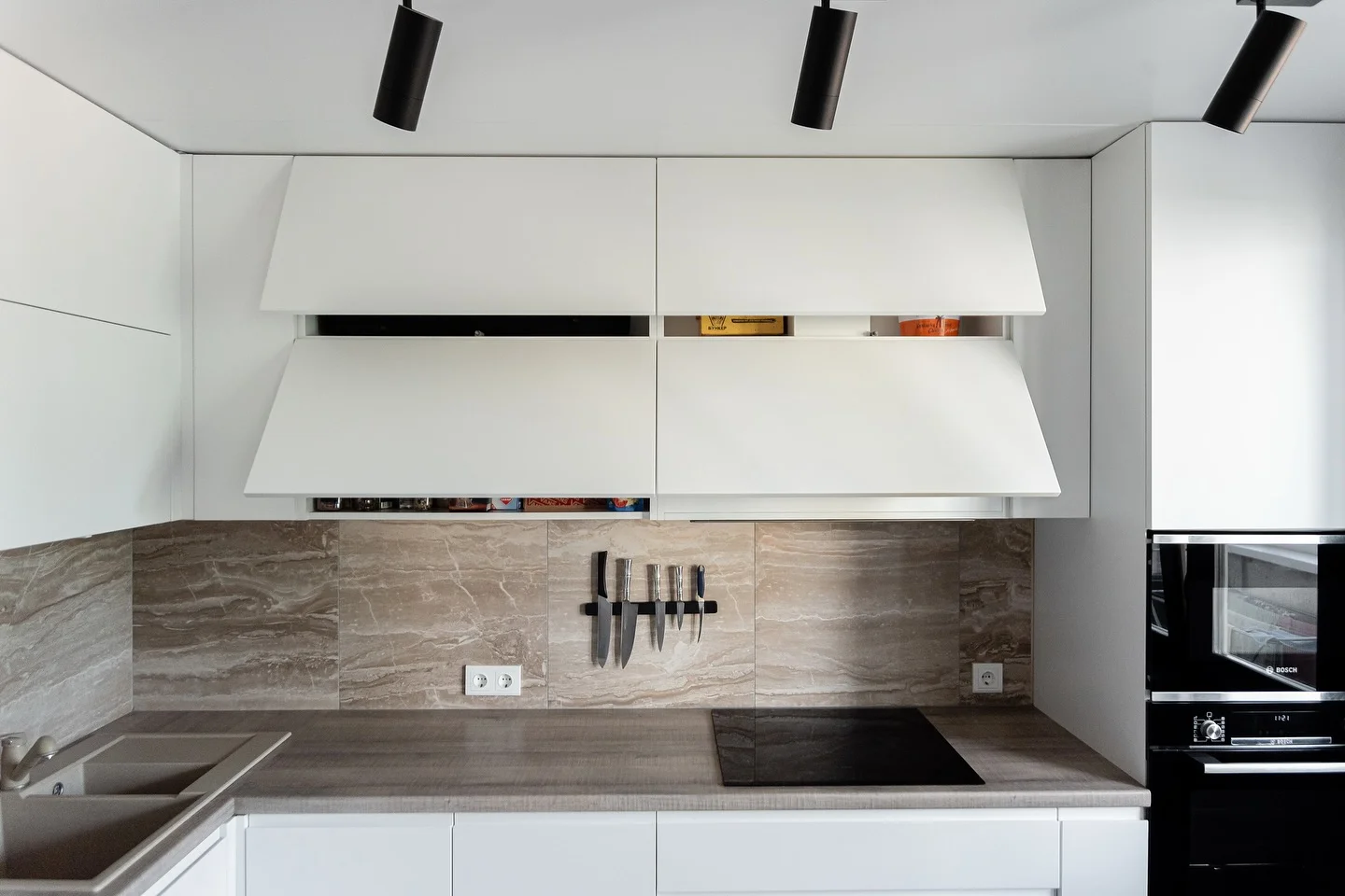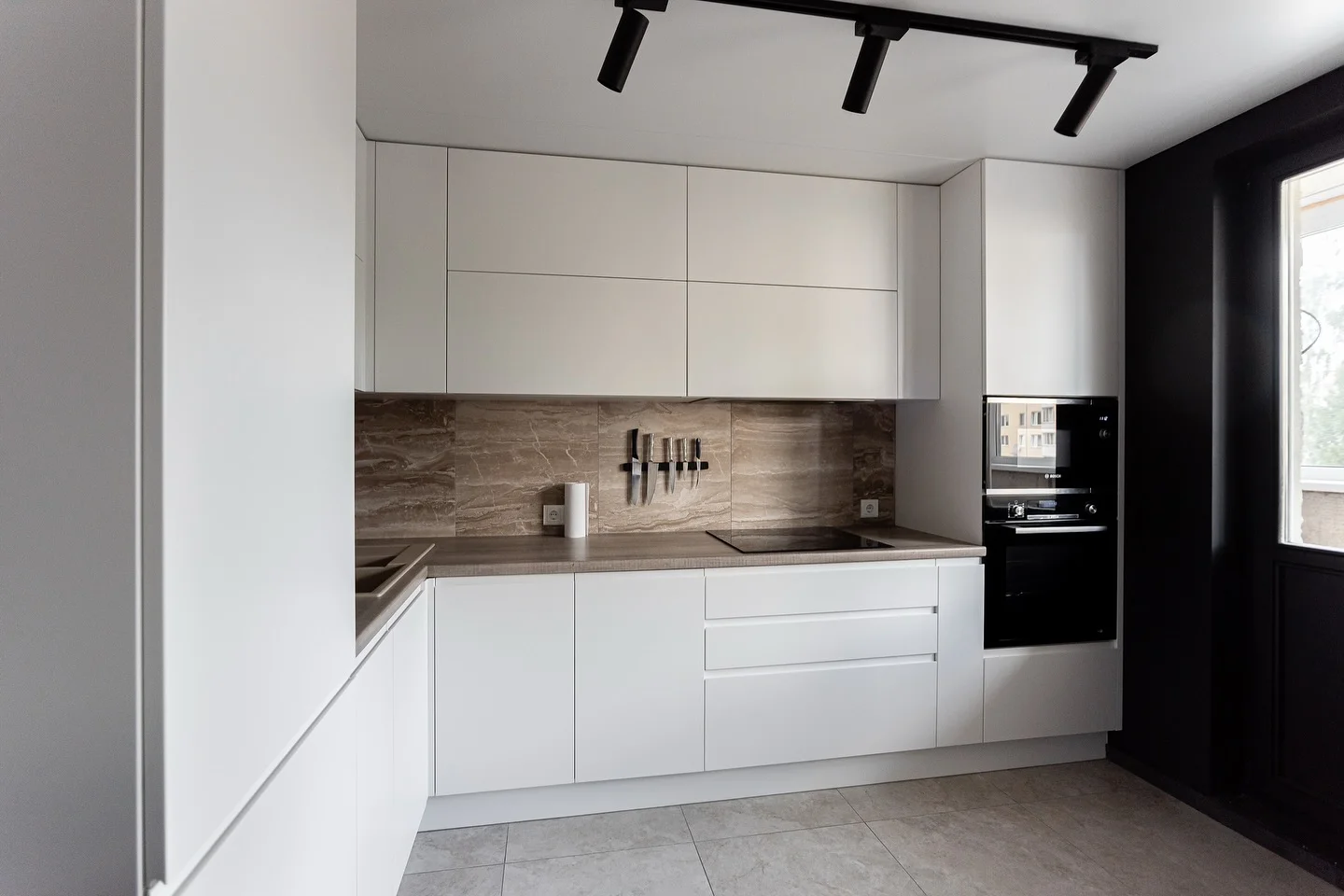 Лаконичная угловая кухня в современном стиле. Матовые белые фасады из МДФ подчеркивают чистоту линий, а столешница и фартук с бежевым каменным рисунком создают теплую атмосферу. Благодаря эргономичной планировке кухня удобна для готовки и хранения. Минималистичный дизайн делает пространство более просторным и светлым.