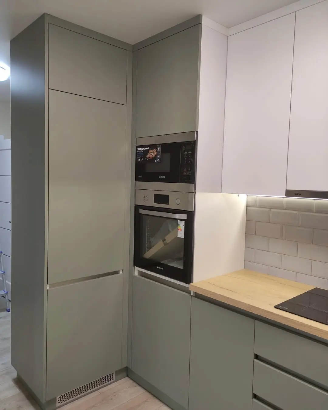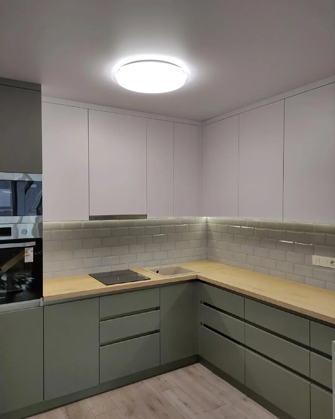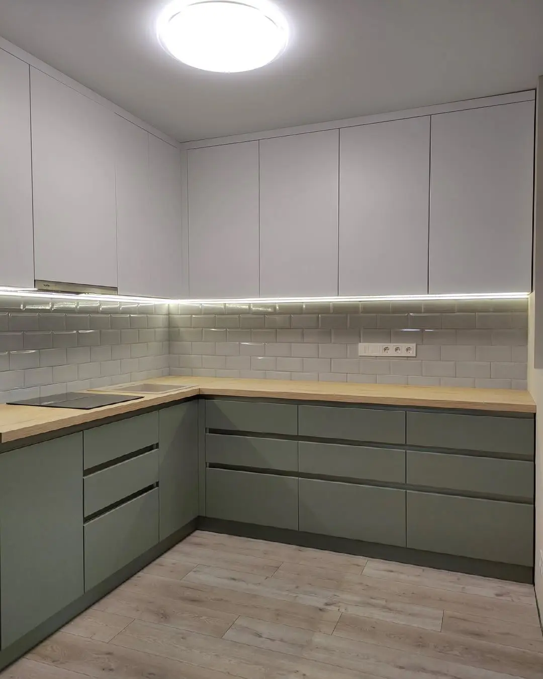 Стильная угловая кухня в скандинавском стиле. Верхние белые матовые фасады гармонируют с серыми нижними модулями, а дубовая столешница добавляет тепла и уюта. Подсветка фартука с плиткой «кабанчик» создает мягкий уютный свет и подчеркивает современный дизайн.