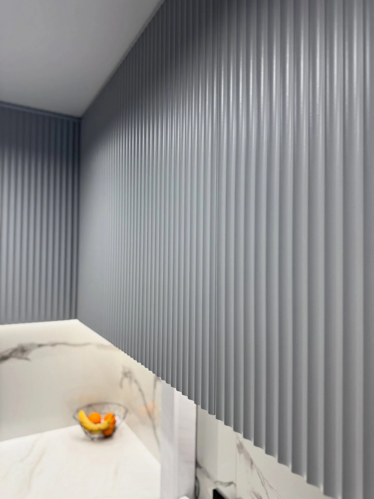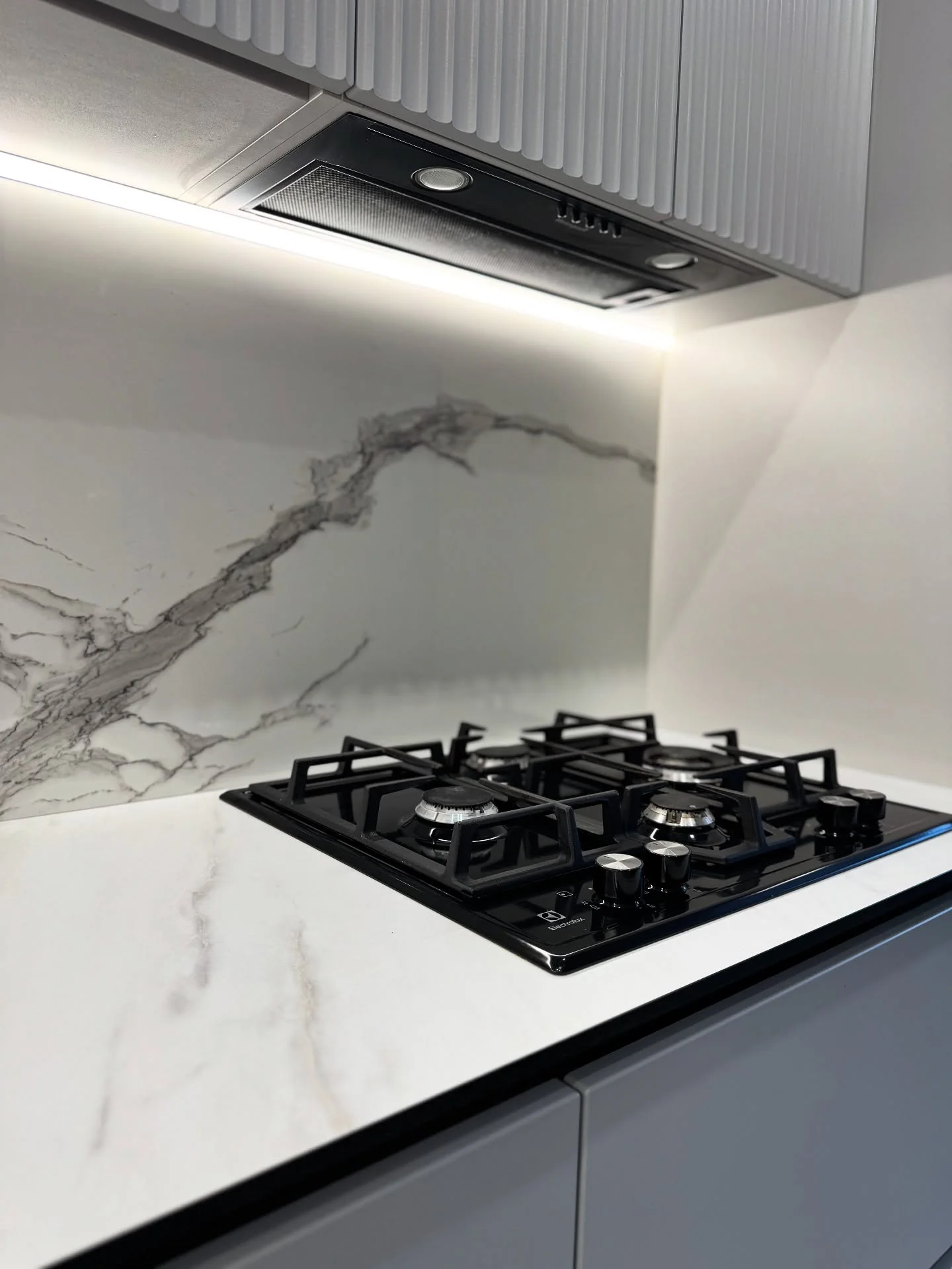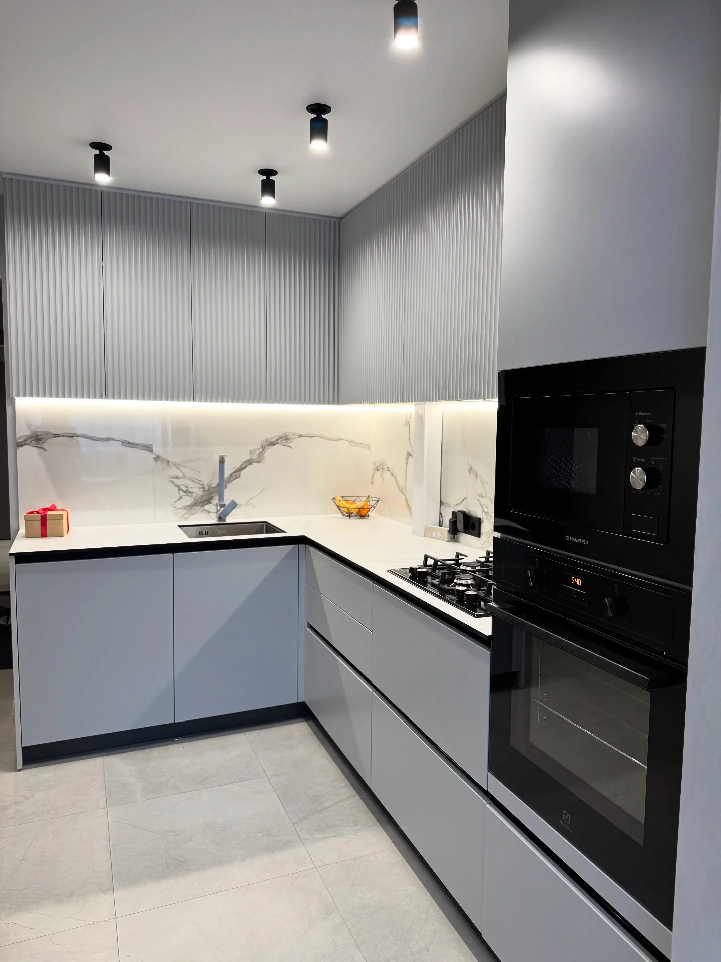 Стильная угловая кухня в светло-серых тонах с матовыми фасадами из МДФ. Белая столешница из искусственного камня с мраморными прожилками гармонично сочетается с серыми панелями. Эргономичное расположение рабочих зон, современная фурнитура Blum и встроенная техника обеспечивают удобство и долговечность. Лаконичный дизайн подчёркивается декоративными рифлёными панелями и встроенной подсветкой.