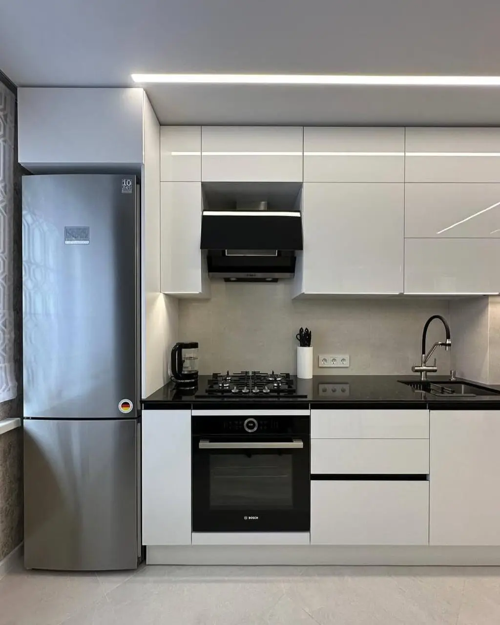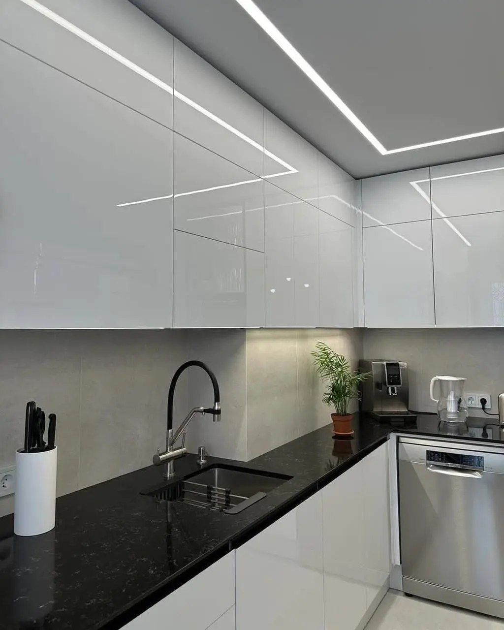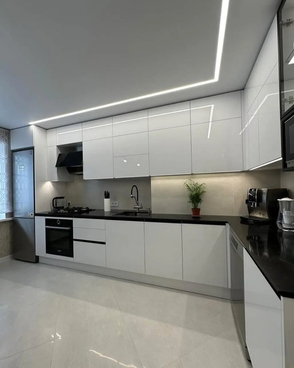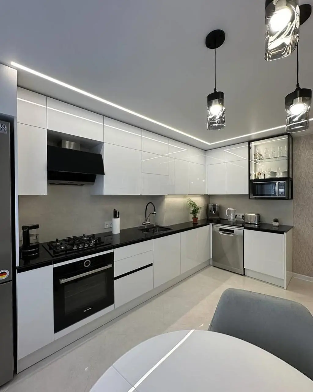 Современная угловая кухня Сноу выполнена в белом цвете с контрастной чёрной столешницей и техникой. Глянцевые фасады отражают свет, визуально расширяя пространство, а встроенная подсветка подчёркивает лаконичные линии гарнитура. Эргономичная планировка обеспечивает удобство использования, создавая гармонию минимализма и практичности.