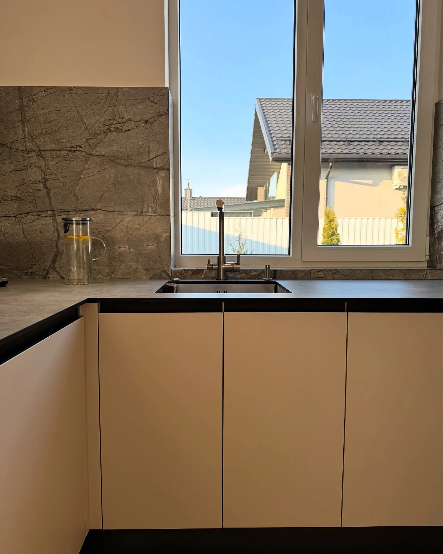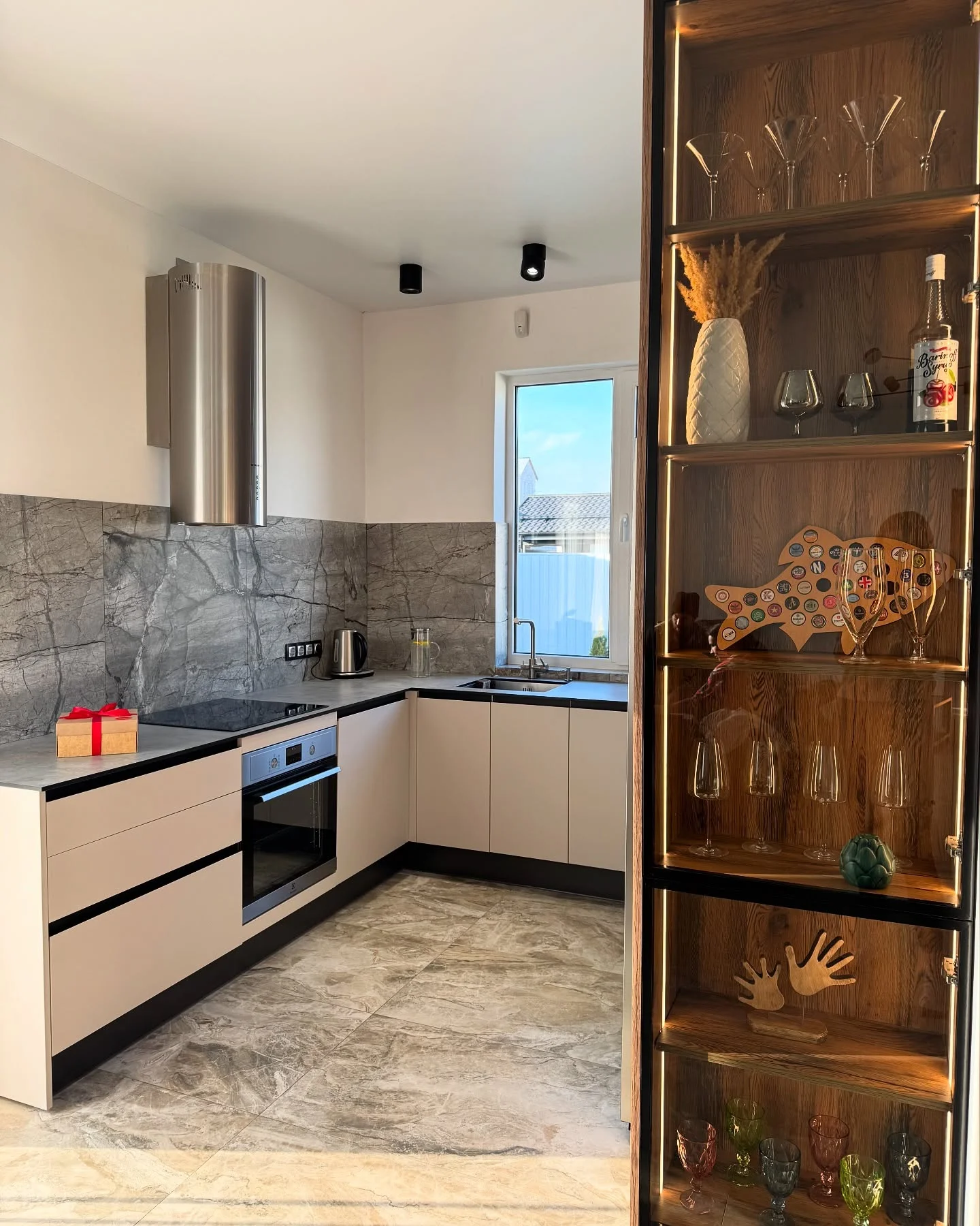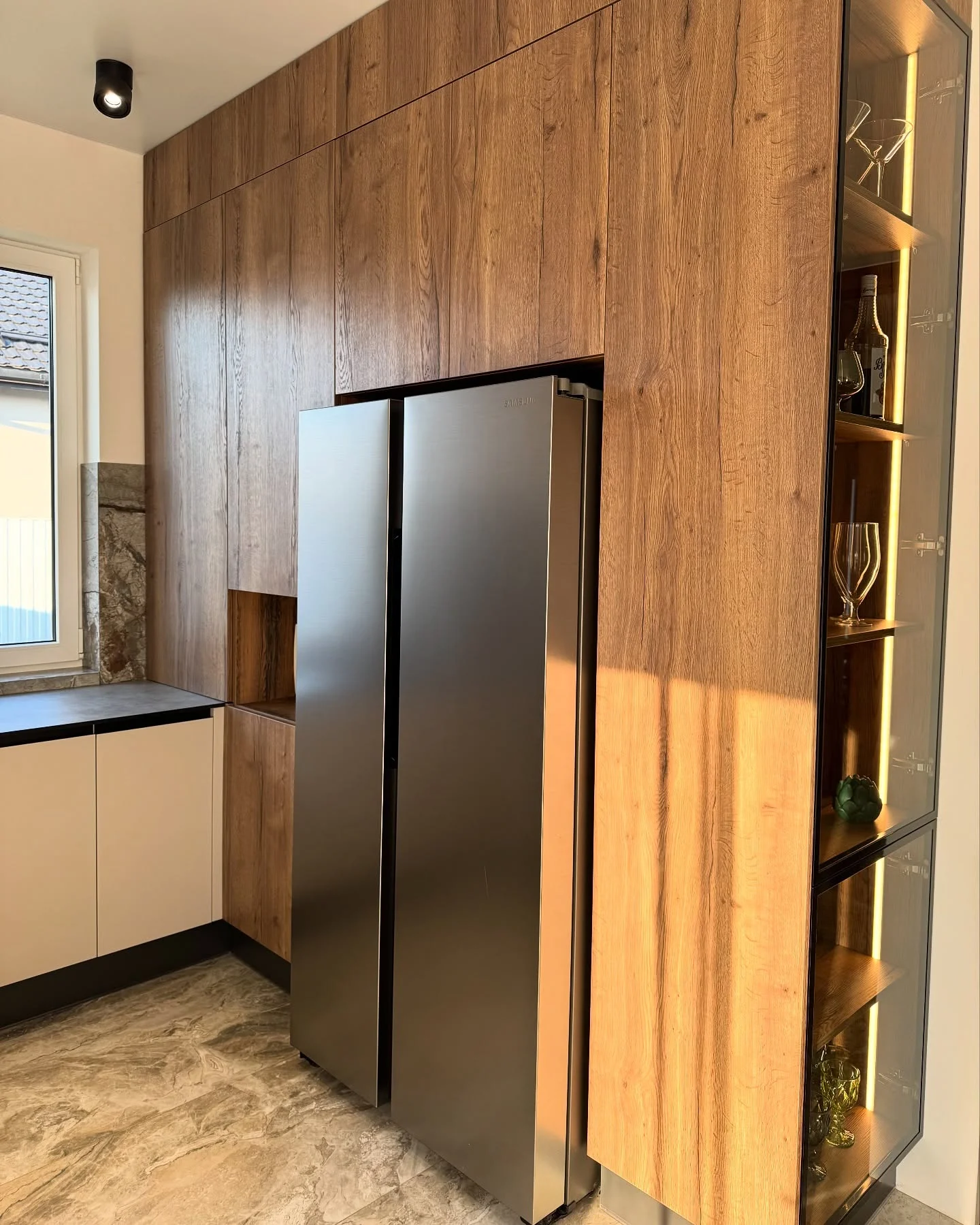 Кухня Тера — гармония природных оттенков и современного минимализма. П-образная планировка делает пространство максимально функциональным: зона готовки, хранения и техника удобно распределены. Тёплая текстура дуба создаёт уют, а матовые фасады в бежевом цвете добавляют лёгкости. Качественная фурнитура Hettich обеспечивает плавность и надёжность в использовании.