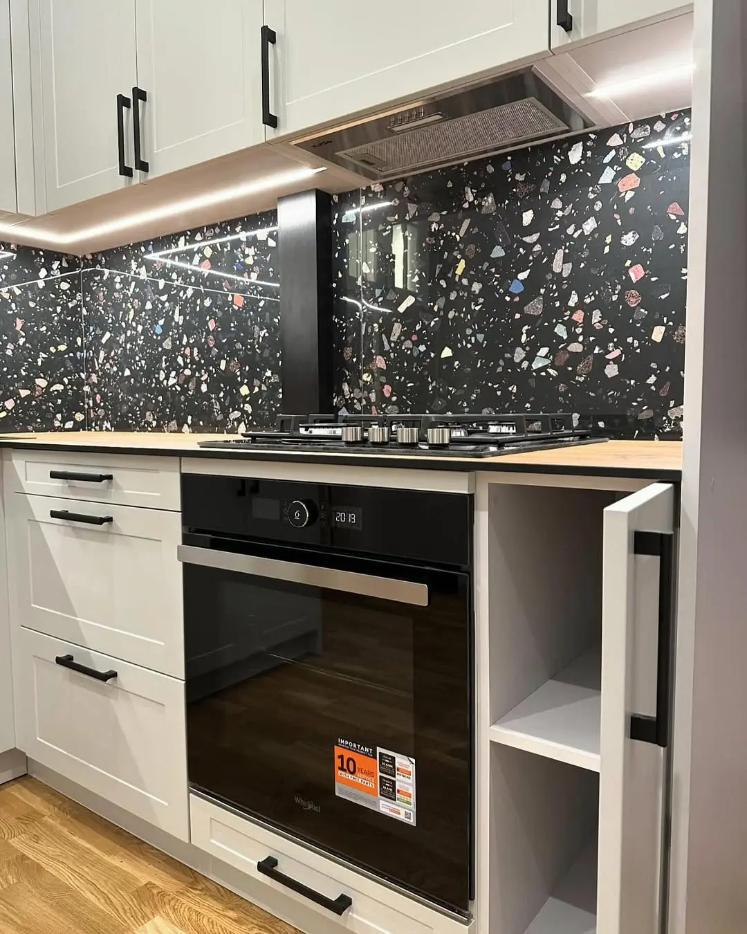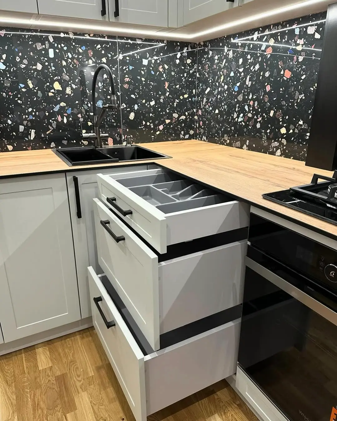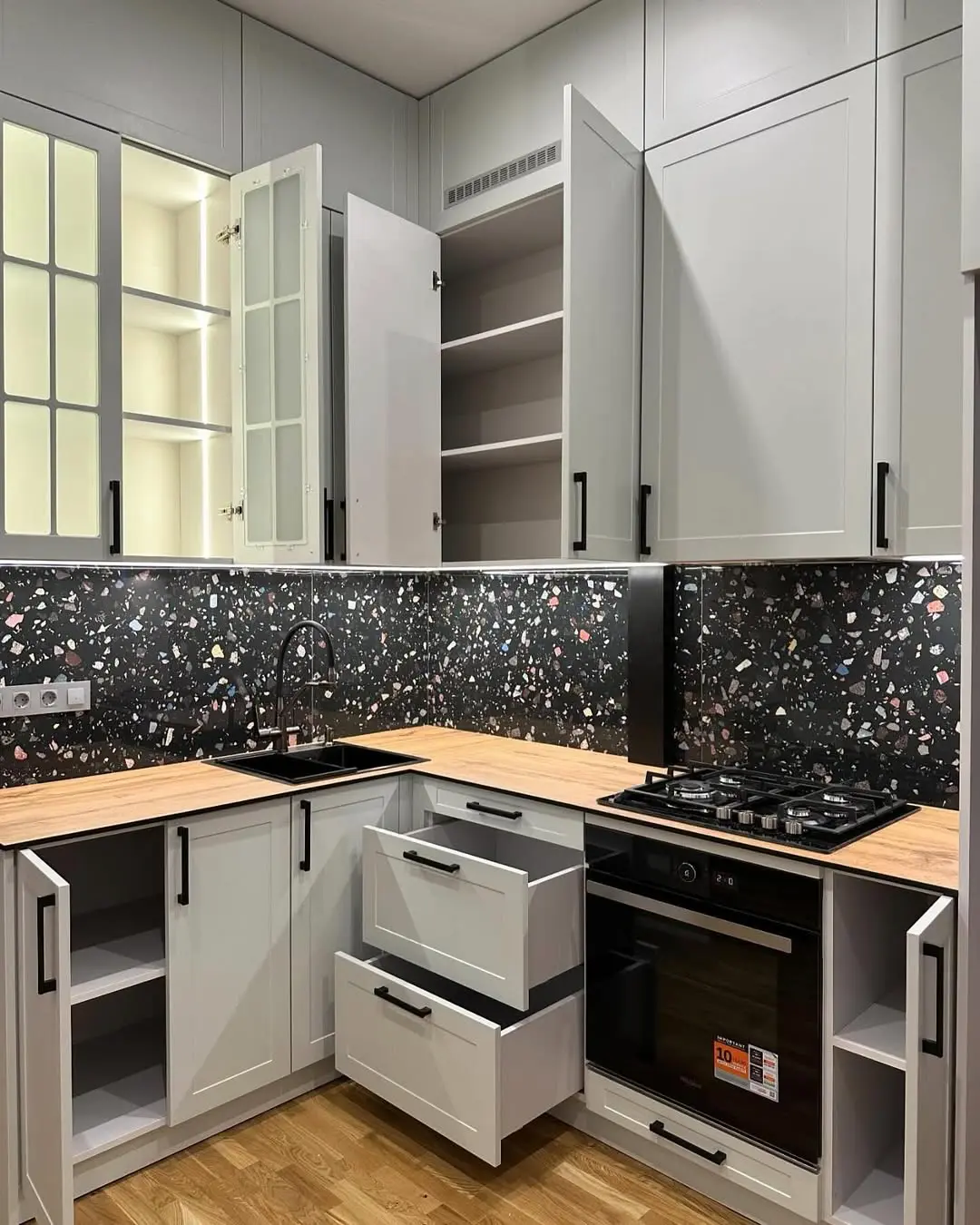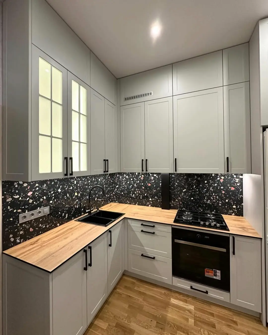 Кухня Террацо — стильное сочетание светло-серых фасадов и эффектного фартука с террацо-декором. Тёплая деревянная столешница добавляет уюта, а чёрные ручки и фурнитура придают современный акцент. Практичная, функциональная и визуально лёгкая — идеальный вариант для квартиры в современном стиле.