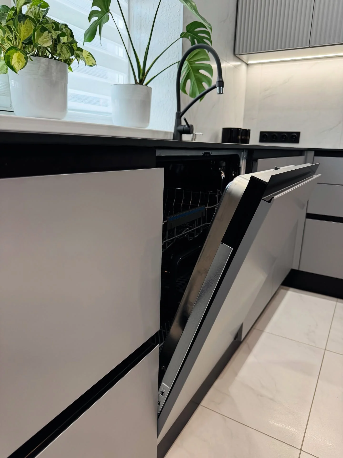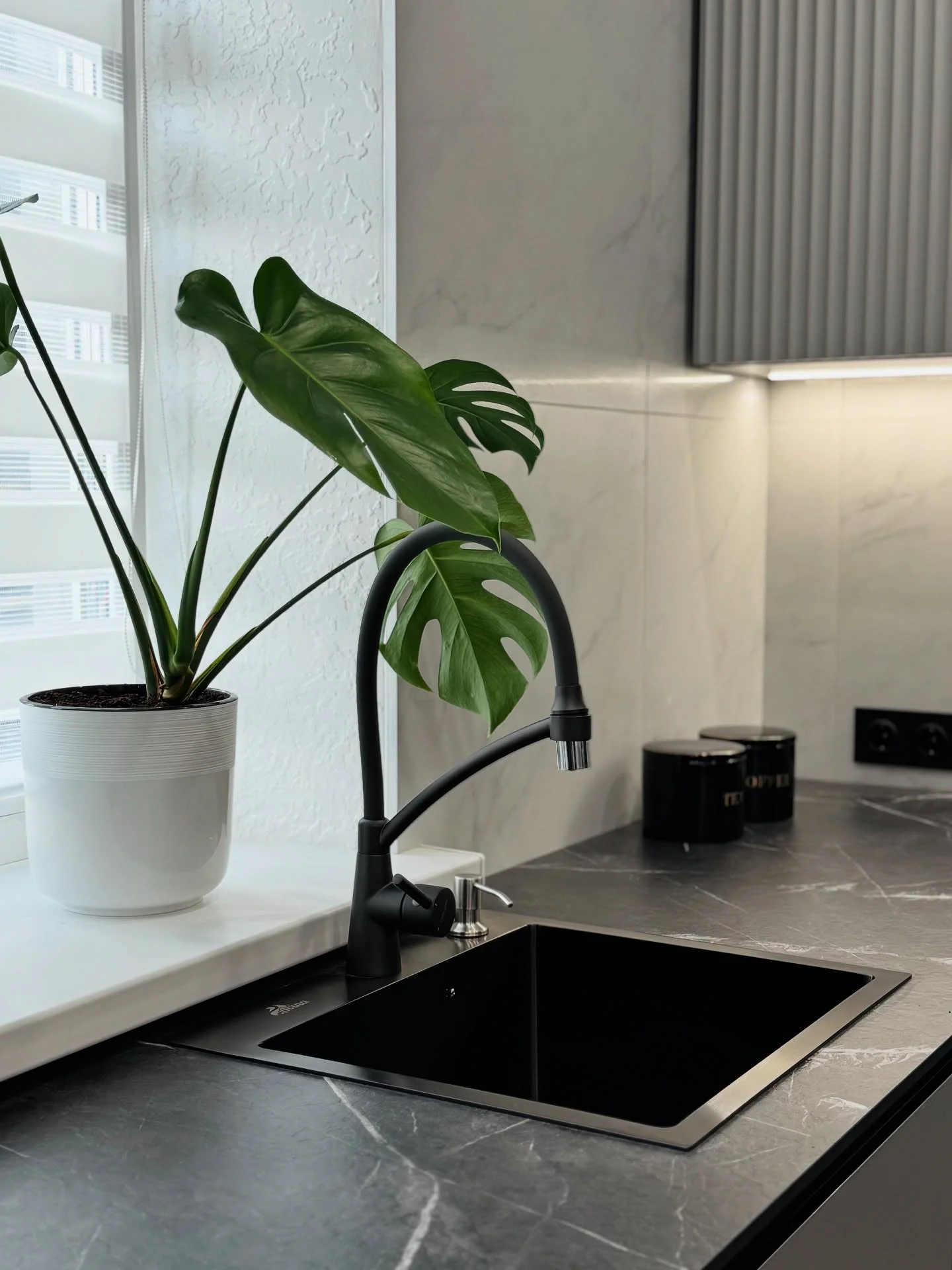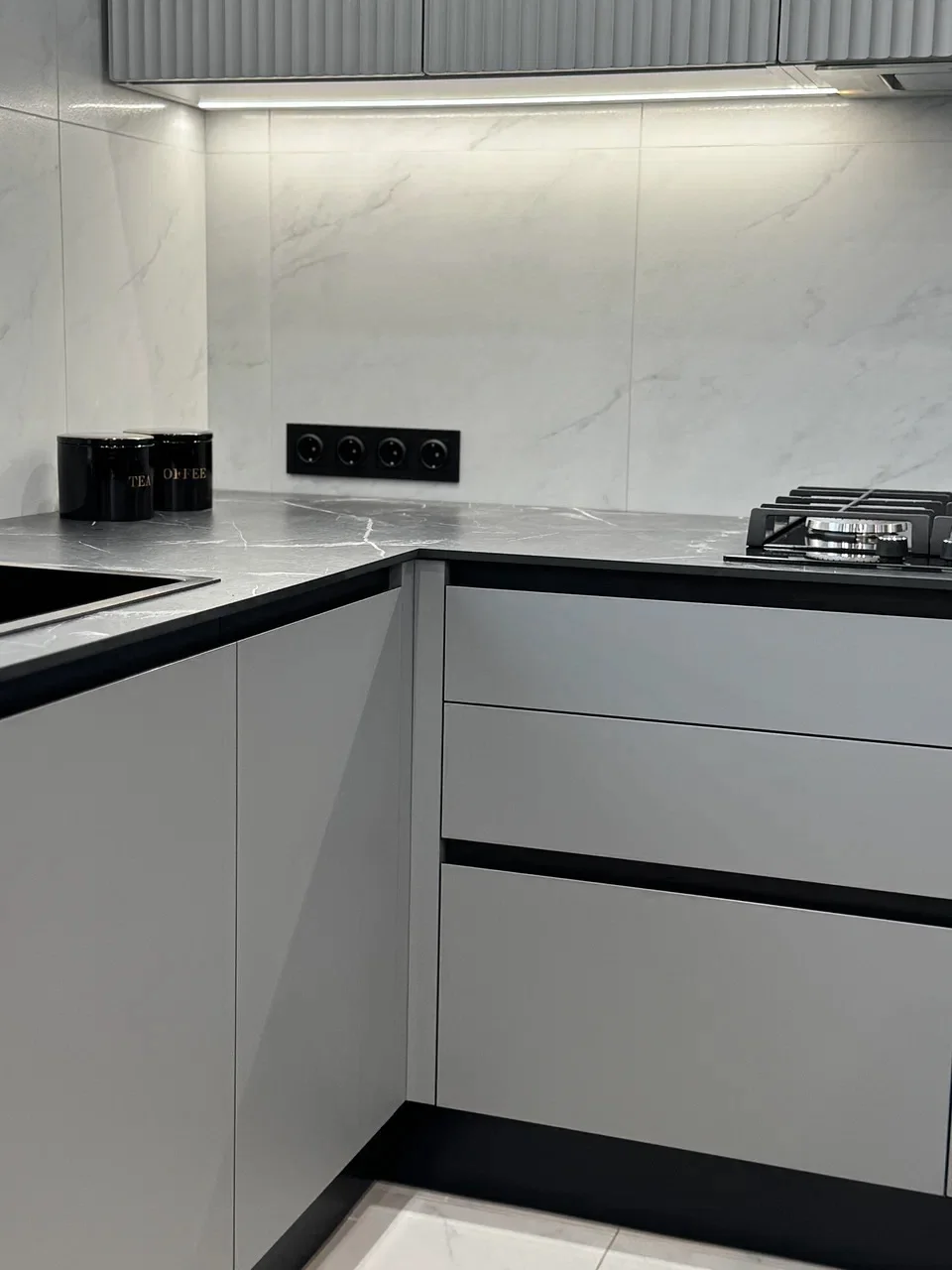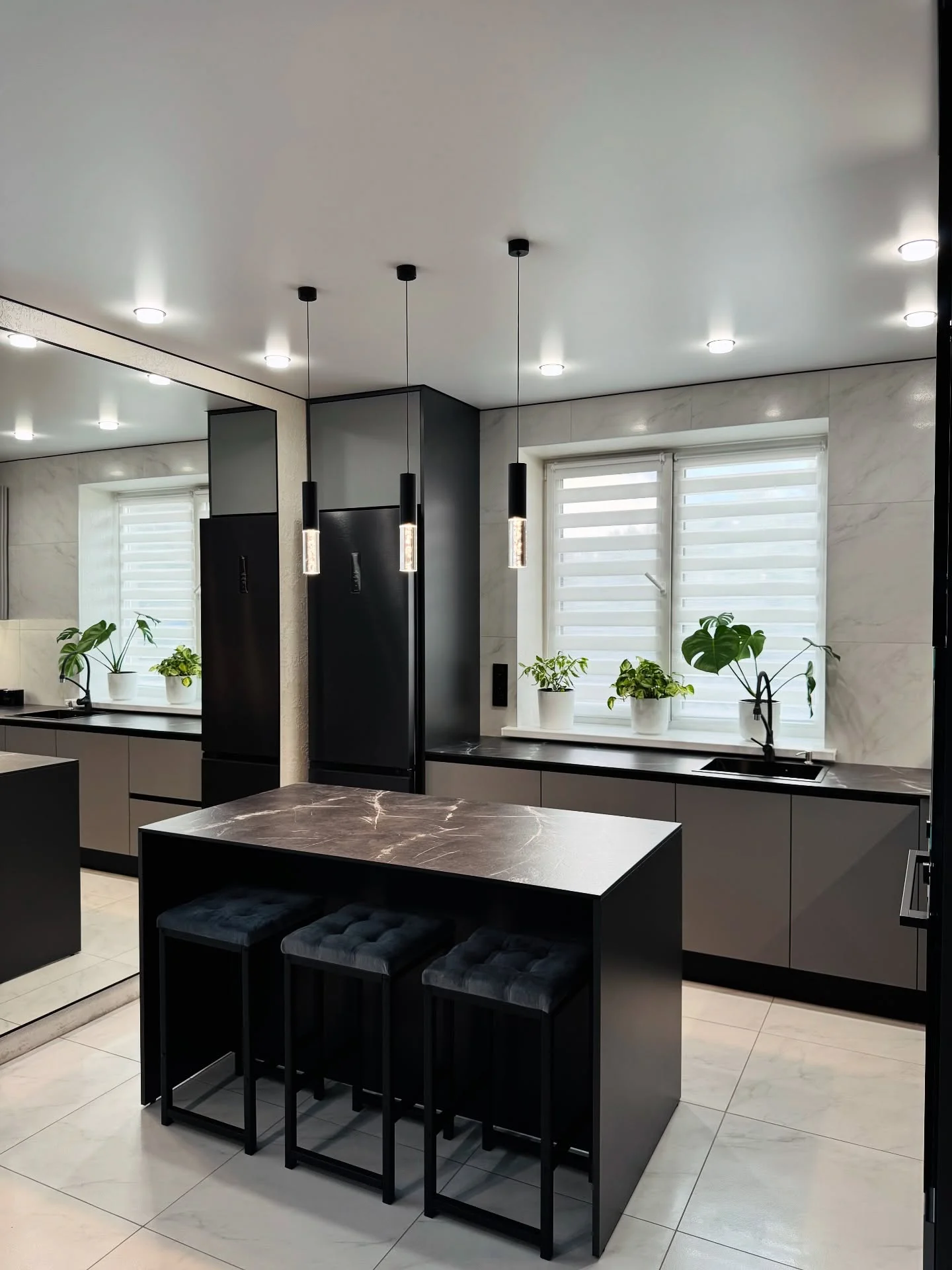 Эта стильная современная кухня в сером и чёрном цвете выполнена в минималистичном дизайне. Остров с функциональной рабочей поверхностью и барными стульями создаёт удобное пространство как для готовки, так и для дружеских встреч. Чёрные акценты на фасадах и столешнице подчёркивают строгость и элегантность интерьера, а встроенные системы хранения делают кухню максимально удобной и практичной.