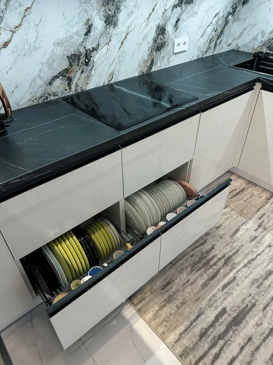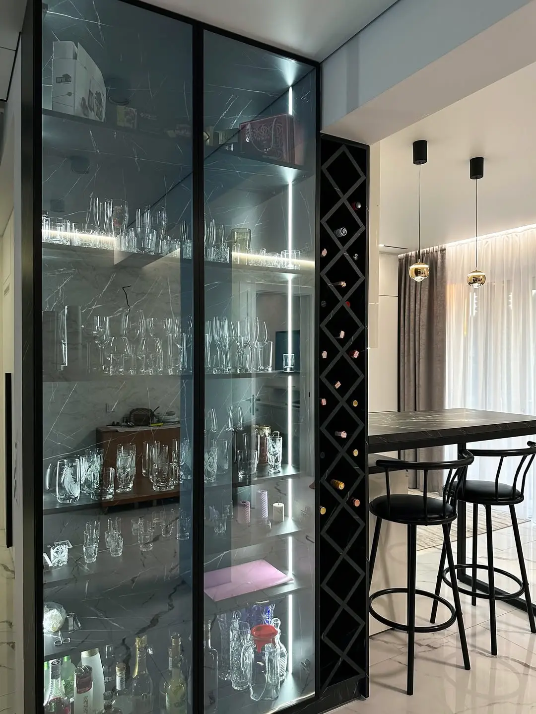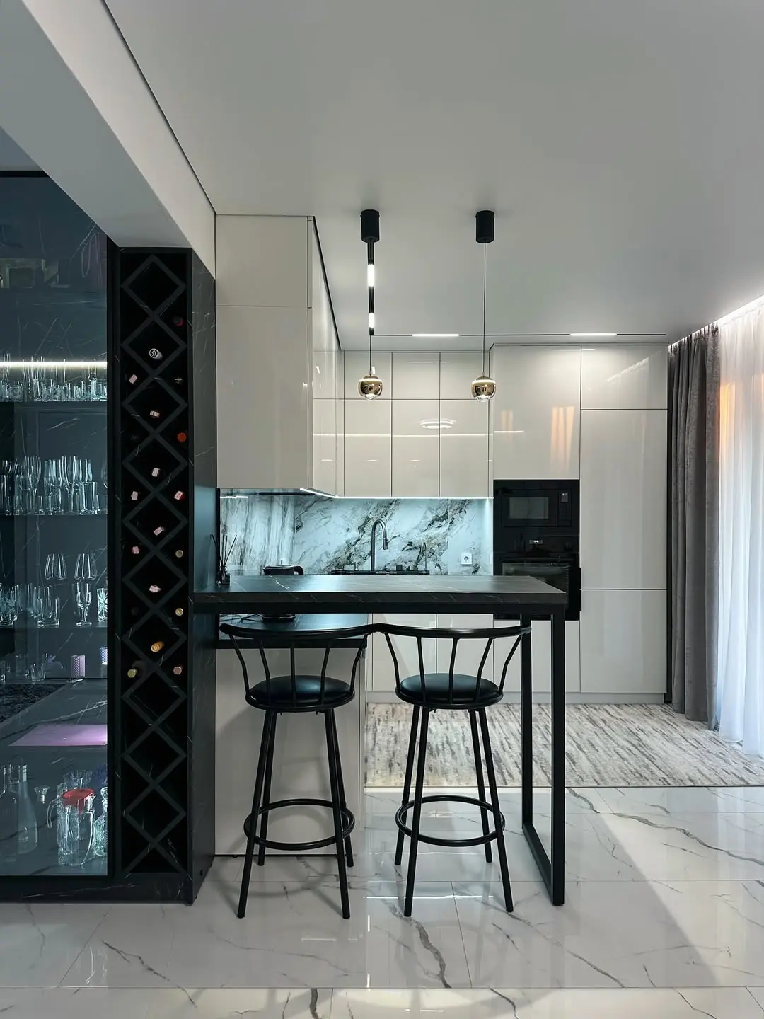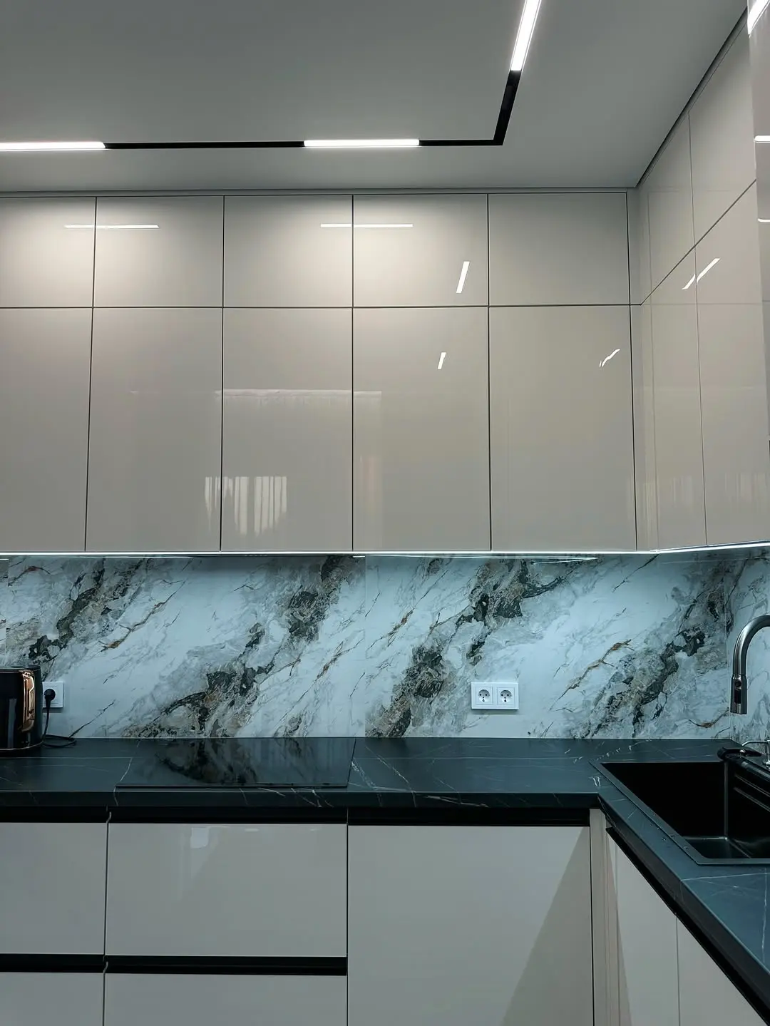 Угловая кухня в современном стиле с бежевыми глянцевыми фасадами и барной стойкой. Каменный фартук с выразительным рисунком придаёт глубину и динамику, а сочетание бежевого и чёрного делает интерьер утончённым и стильным. Встроенный винный стеллаж дополняет композицию и добавляет функциональности.