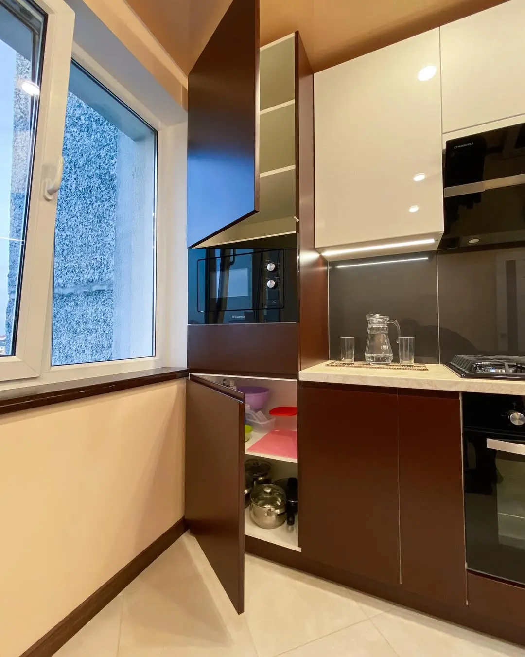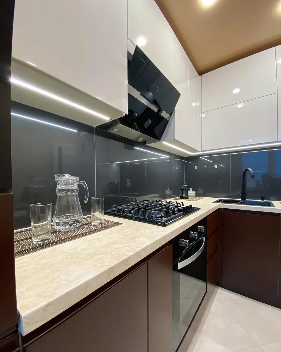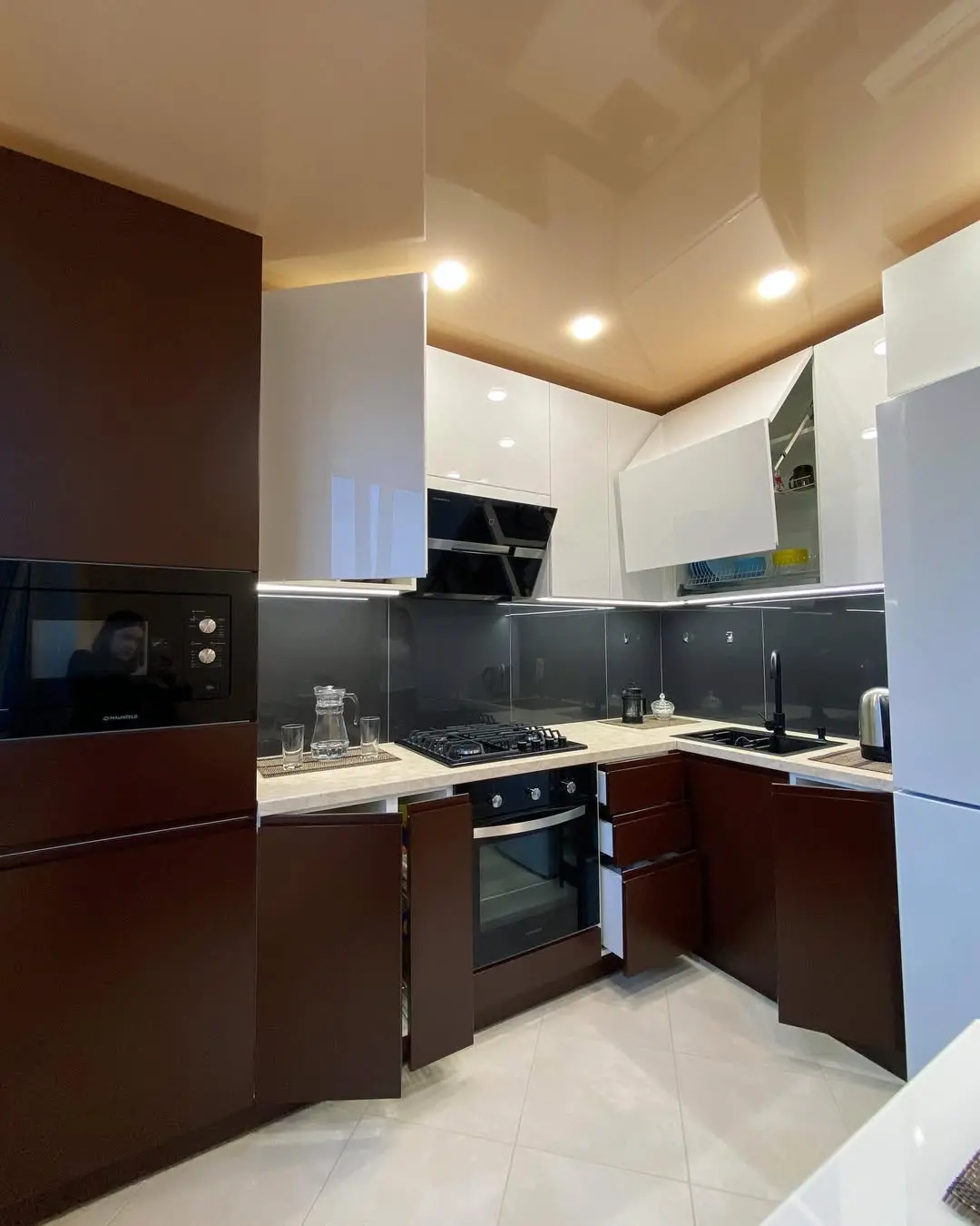 Кухня «Сиена» — воплощение уюта и сдержанной элегантности. Контраст глубокого коричневого низа и белоснежных глянцевых верхних фасадов создаёт гармоничный и стильный интерьер. Светлая столешница под камень добавляет тепла, а лаконичные линии подчеркивают современный характер кухни. Идеальный выбор для тех, кто ценит практичность и уют.