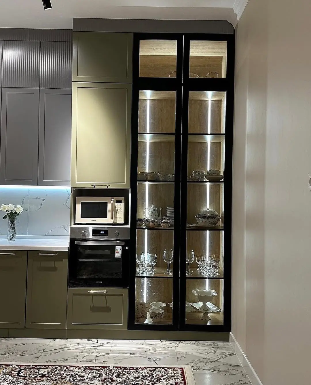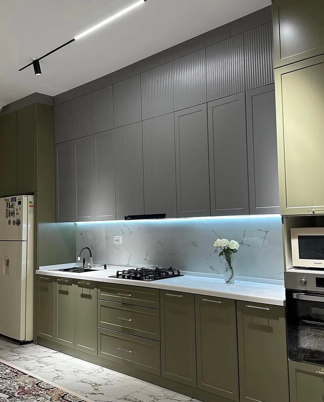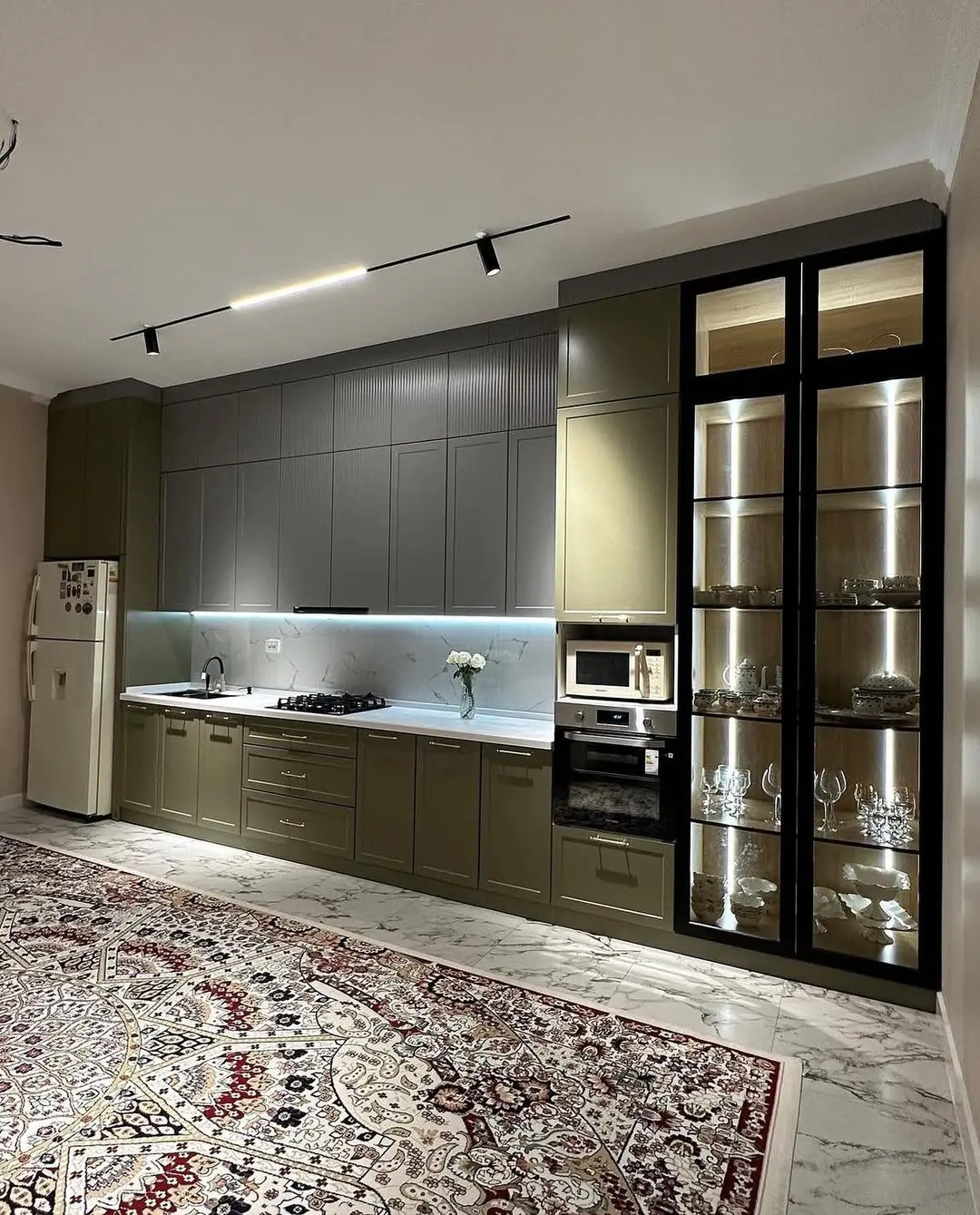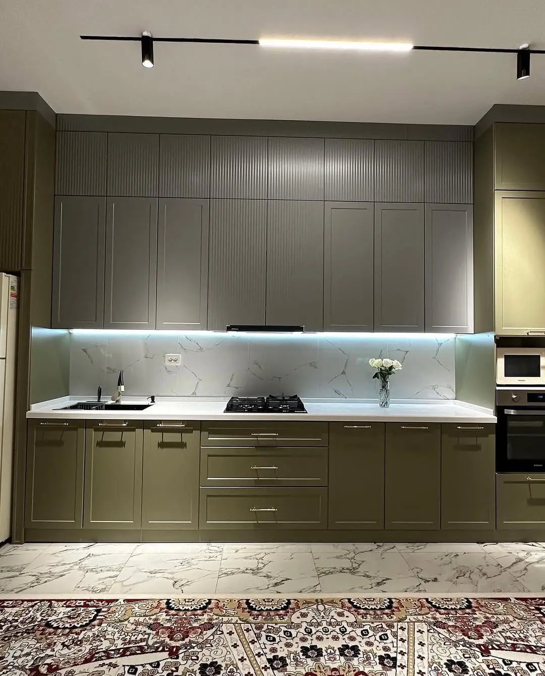 Кухня Верде Лайт — элегантное сочетание неоклассики и современных тенденций. Матовые фасады с фрезеровкой в благородных оттенках оливкового и серого создают гармоничный, спокойный интерьер. Светлая мраморная столешница и фартук визуально расширяют пространство, добавляя лёгкости композиции. Встроенная техника и эффектная витрина с подсветкой подчёркивают изысканность дизайна, а надёжная фурнитура Firmax обеспечивает плавность и долговечность эксплуатации.