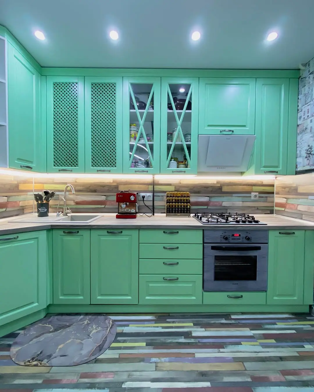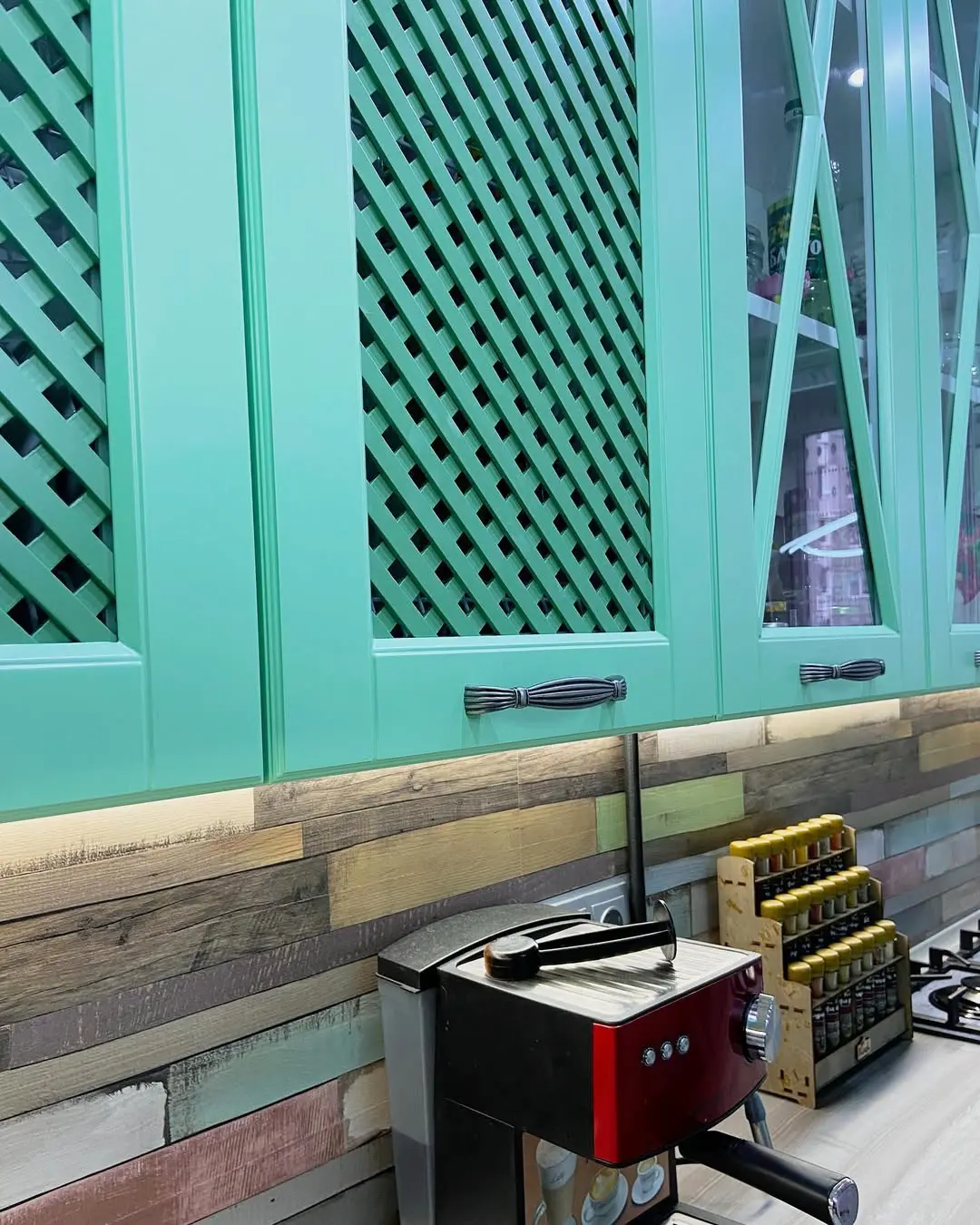 Кухня «Вилла» наполнена весенней свежестью и уютом. Нежно-зелёные фасады прекрасно сочетаются с белыми элементами и натуральной столешницей под дерево. Комбинация стеклянных и решётчатых фасадов придаёт интерьеру лёгкость и изысканность. Идеальный выбор для тех, кто хочет добавить в дом тепло и настроение природы.