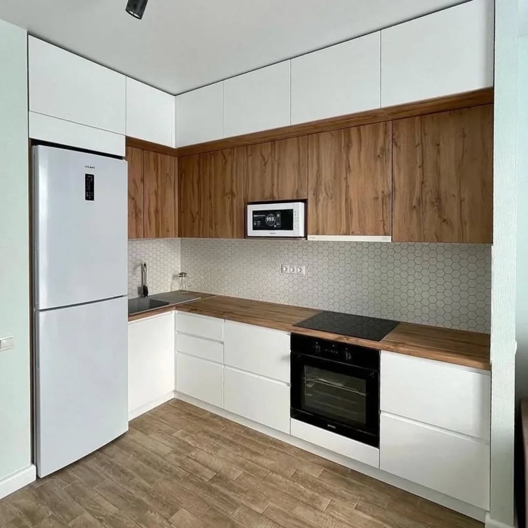 Белая кухня с фасадами под дерево и плиткой-сотами