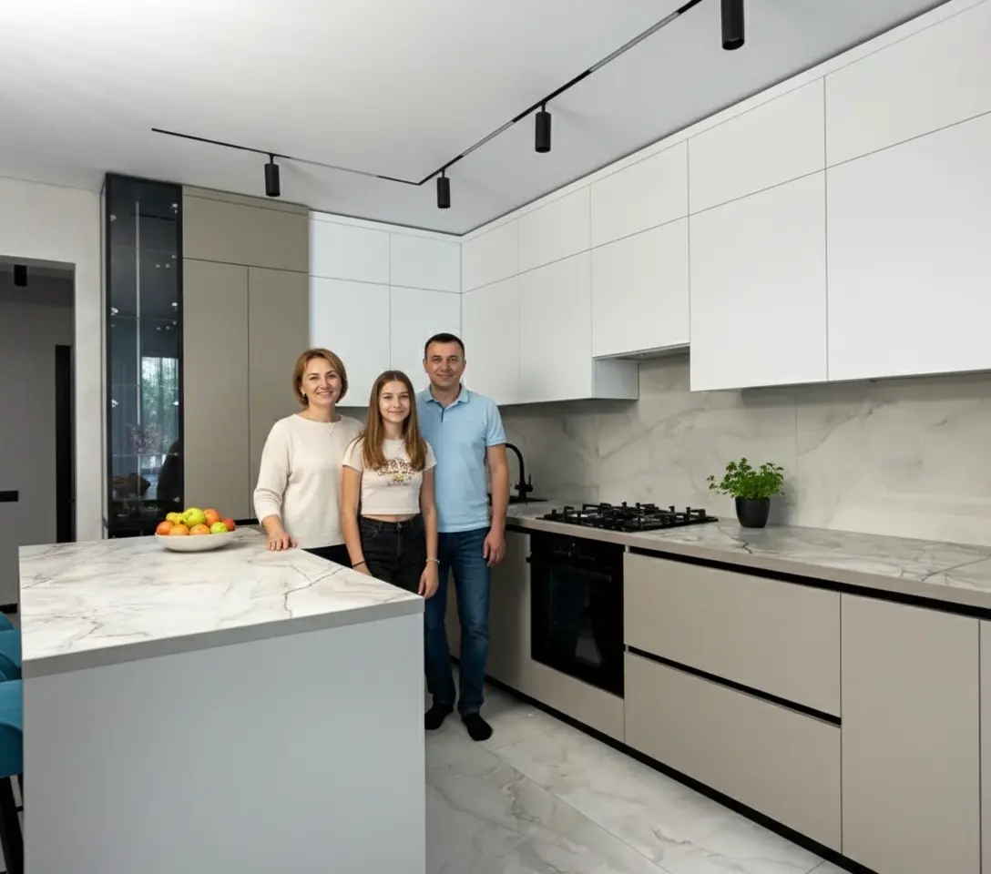 Семья на фоне стильной серо-белой кухни с барной столешницей и встроенной техникой