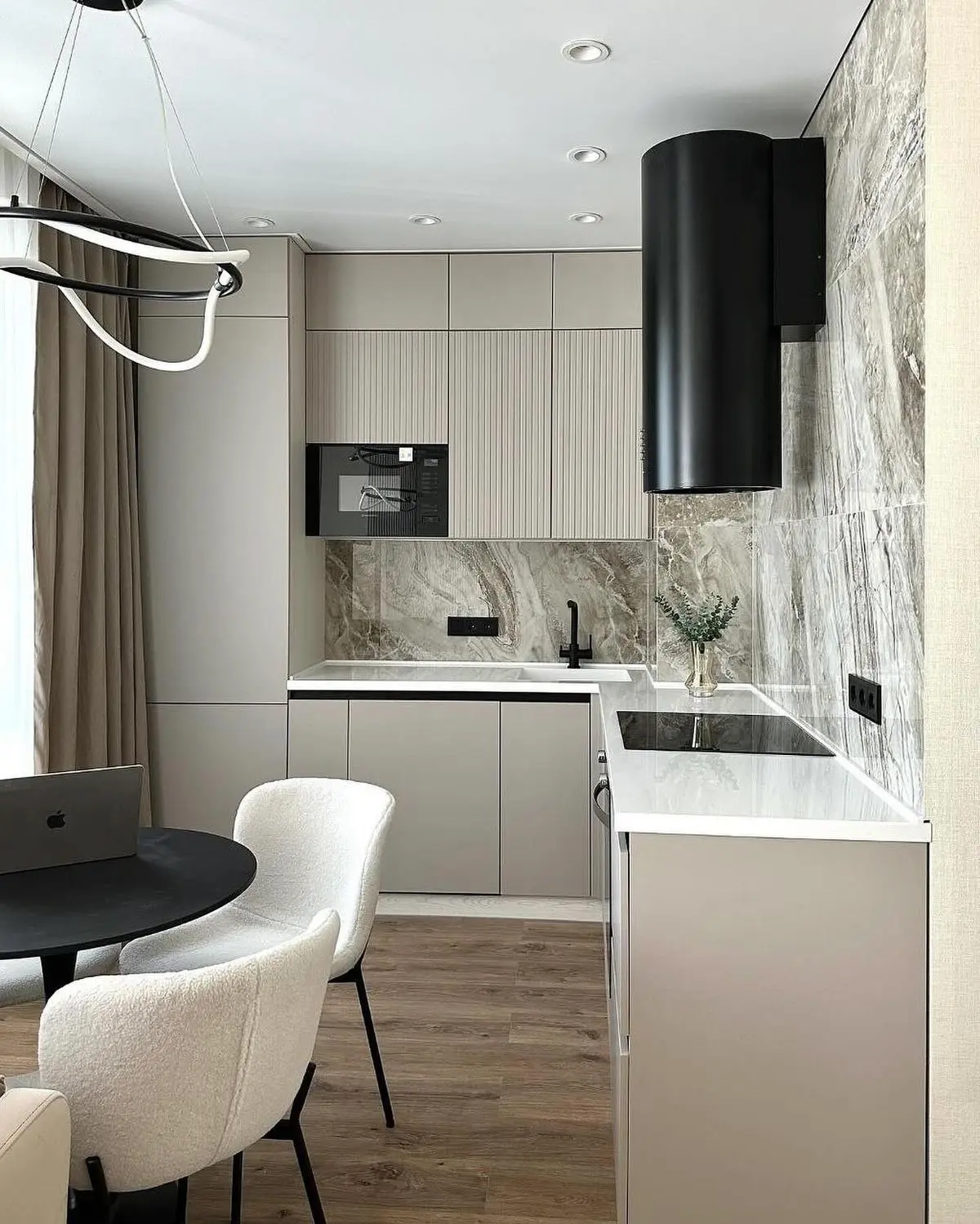 Кухня с мраморным фартуком и стильной черной вытяжкой в современном интерьере