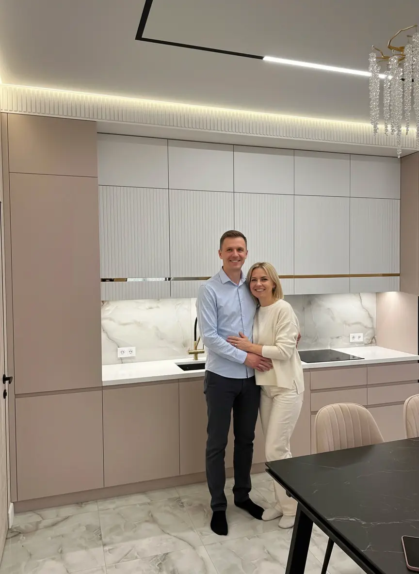 Пара на фоне серой угловой кухни с деревянной столешницей