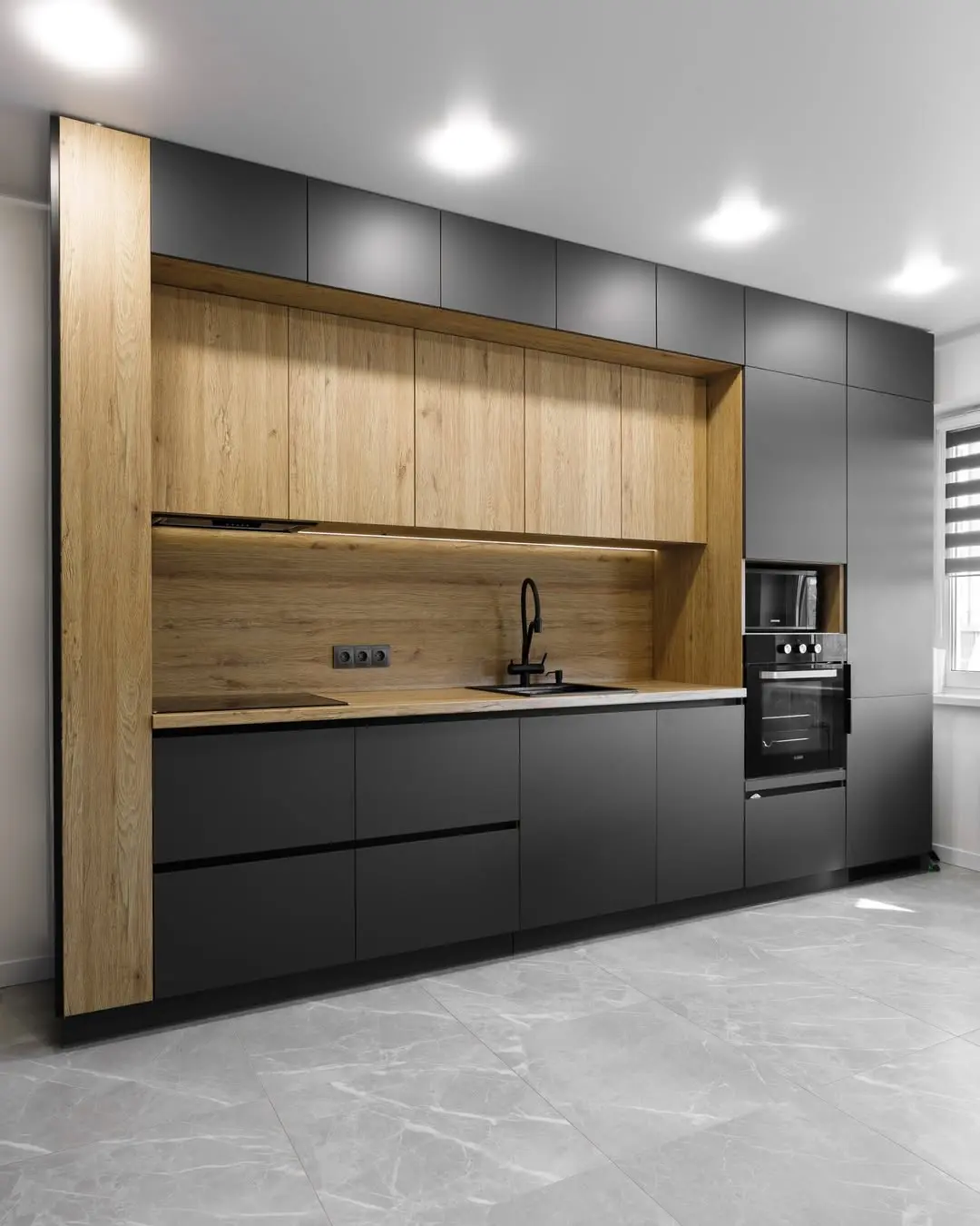 Серая кухня в стиле минимализм с деревянной столешницей и встроенной техникой