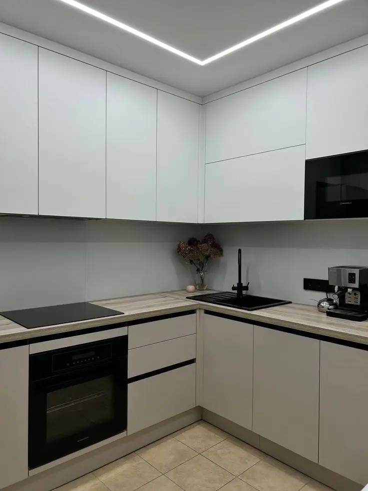 Белая кухня в стиле минимализм с встроенной техникой и черным смесителем