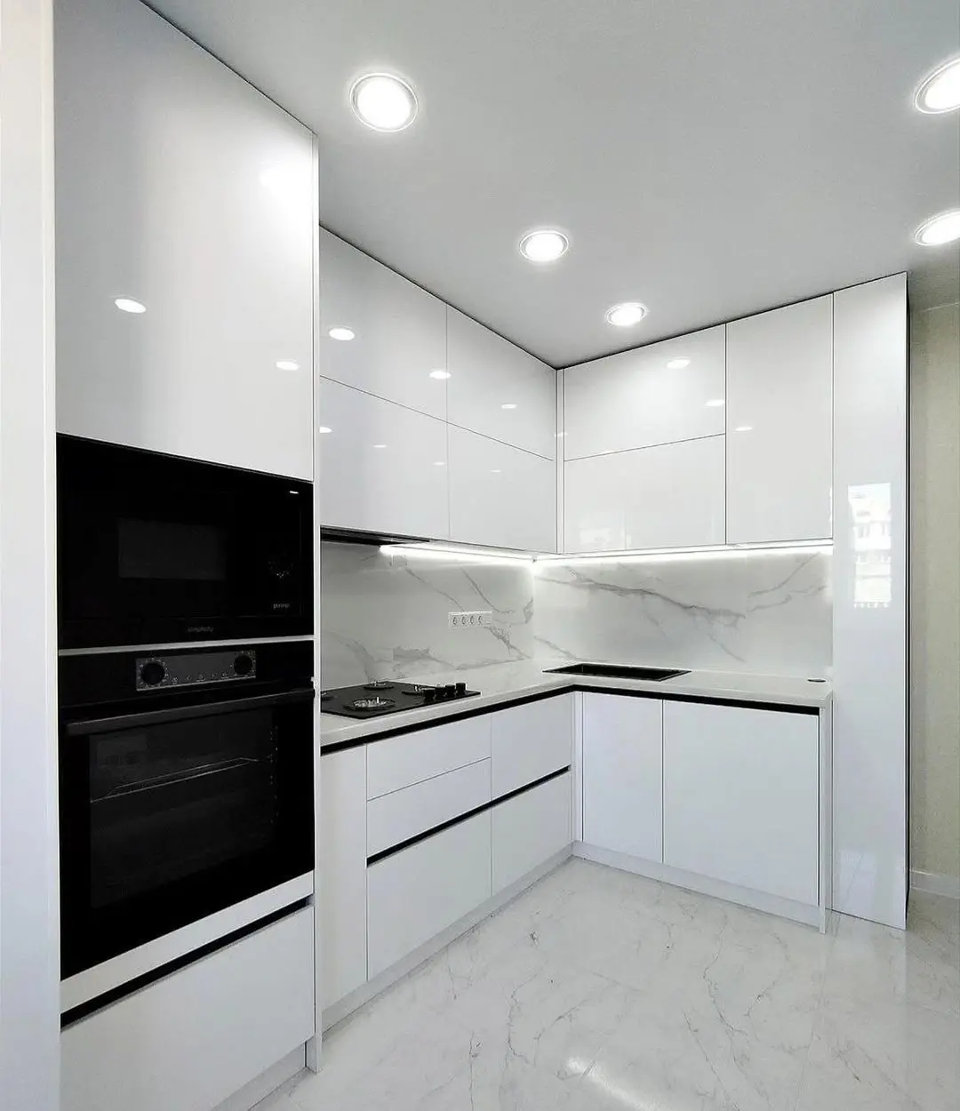 Белая угловая кухня в современном стиле с глянцевыми фасадами