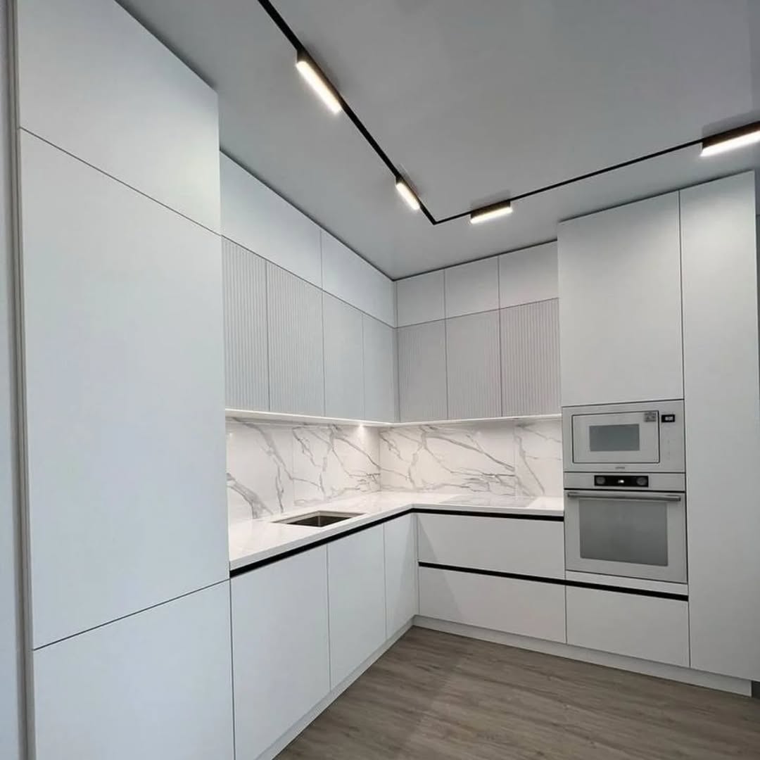 Минималистичная белая кухня с подсветкой и мраморным рисунком