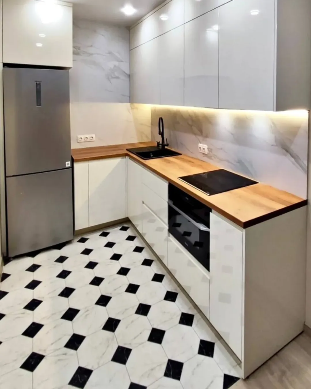 Белая глянцевая кухня с деревянной столешницей и мраморным фартуком