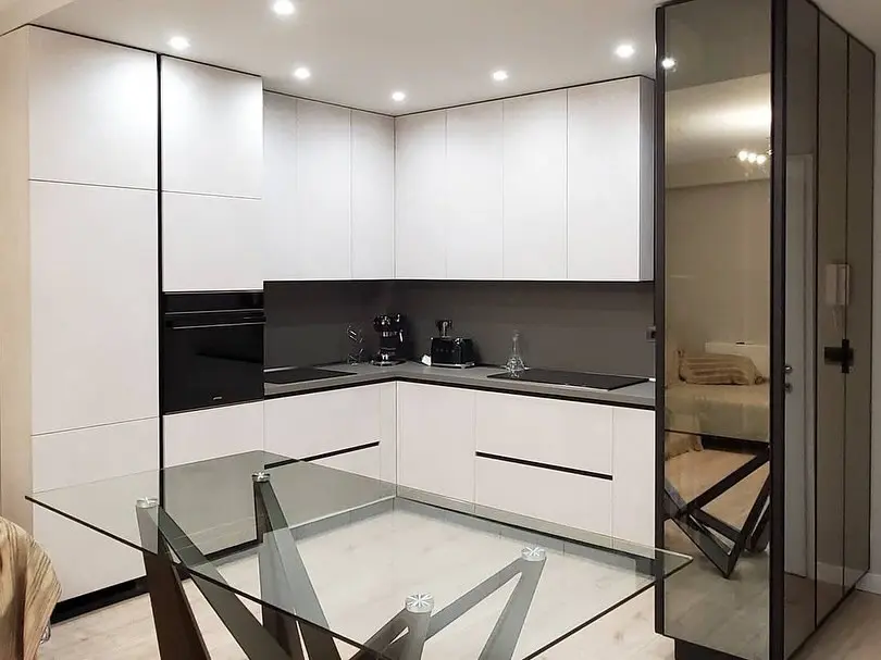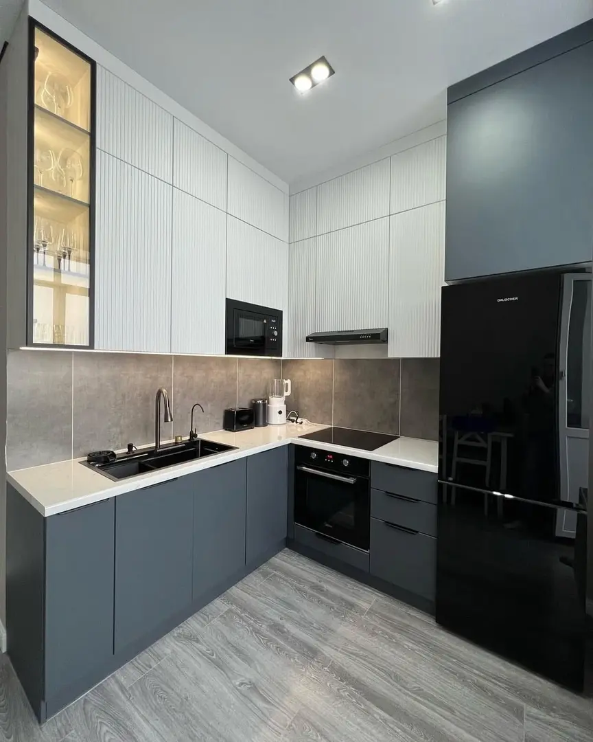 Угловая кухня в серо-белых тонах с черной техникой и стеклянным шкафом