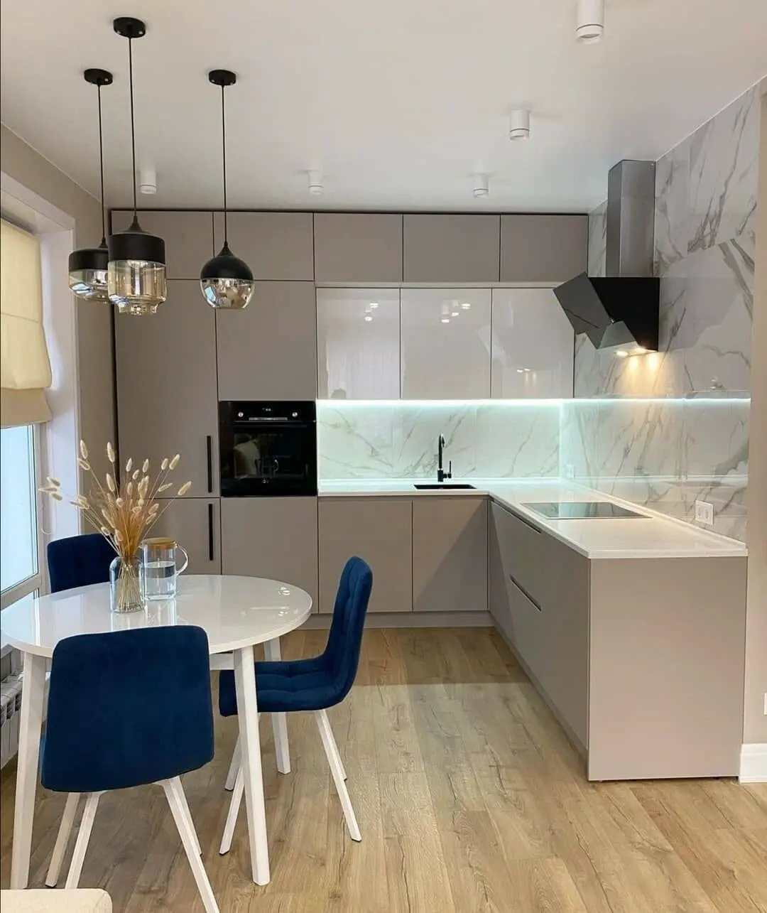 Угловая бежевая кухня с мраморным фартуком и синими стульями в обеденной зоне