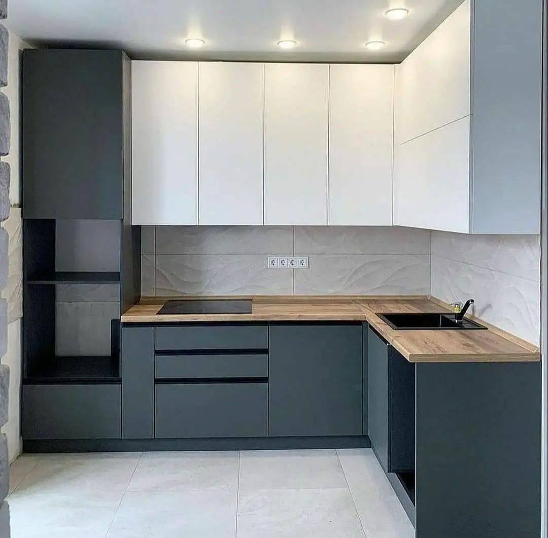 Угловая матовая кухня с белыми верхними и темными нижними фасадами