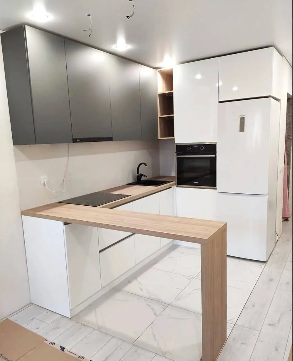 Кухня в современном стиле с барной стойкой и серыми верхними шкафами