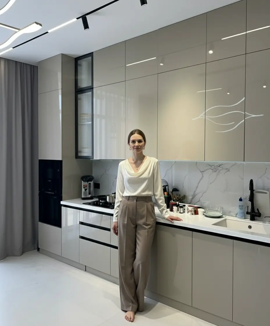 Женщина на фоне глянцевой бежевой кухни с мраморным фартуком и встроенной техникой