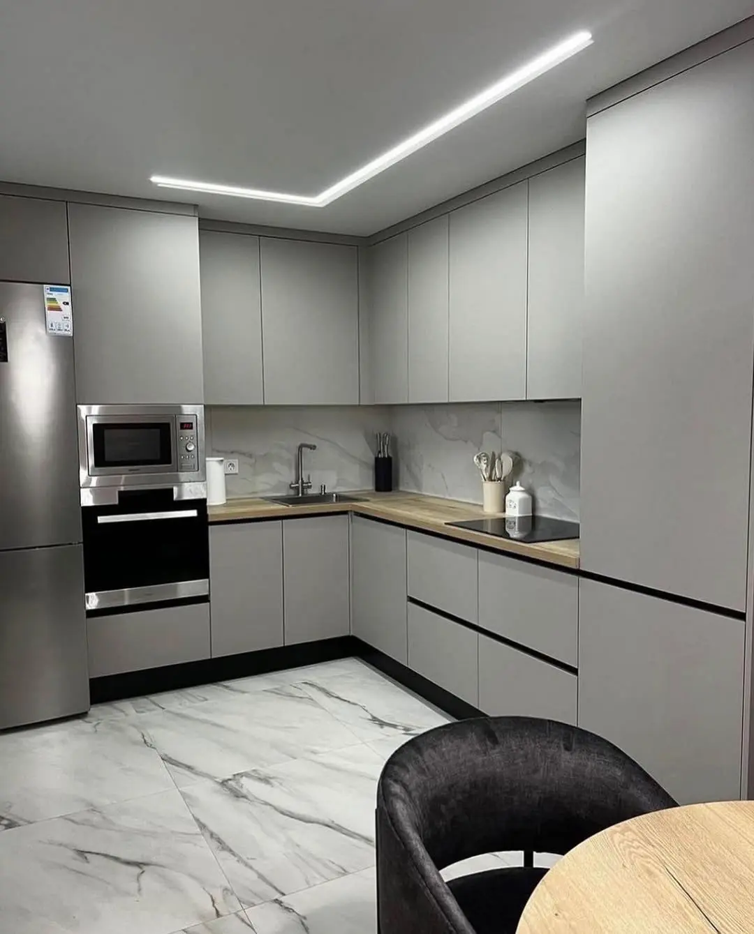 Угловая кухня серебристо-серая с белой столешницей и встроенной техникой