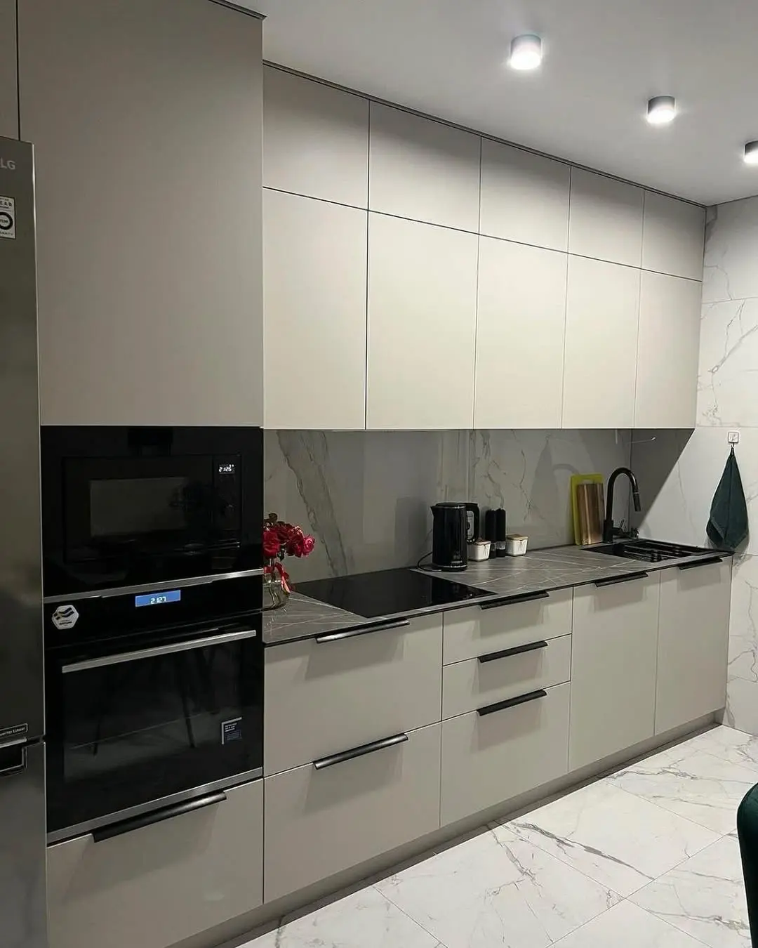 Прямая кухня в светло-бежевых фасадах с мраморным фартуком и черной встроенной техникой