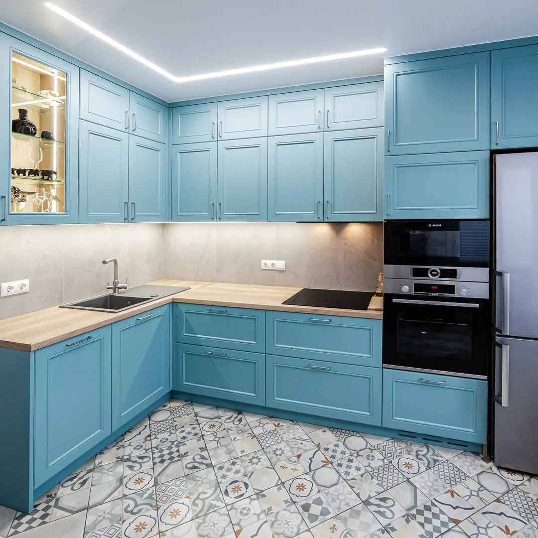 Голубая угловая кухня с деревянной столешницей и плиточным узорчатым полом