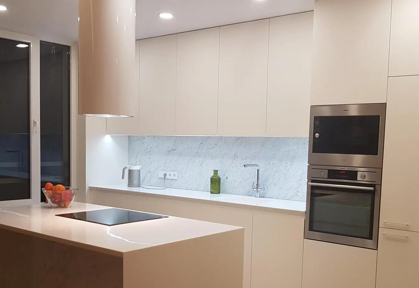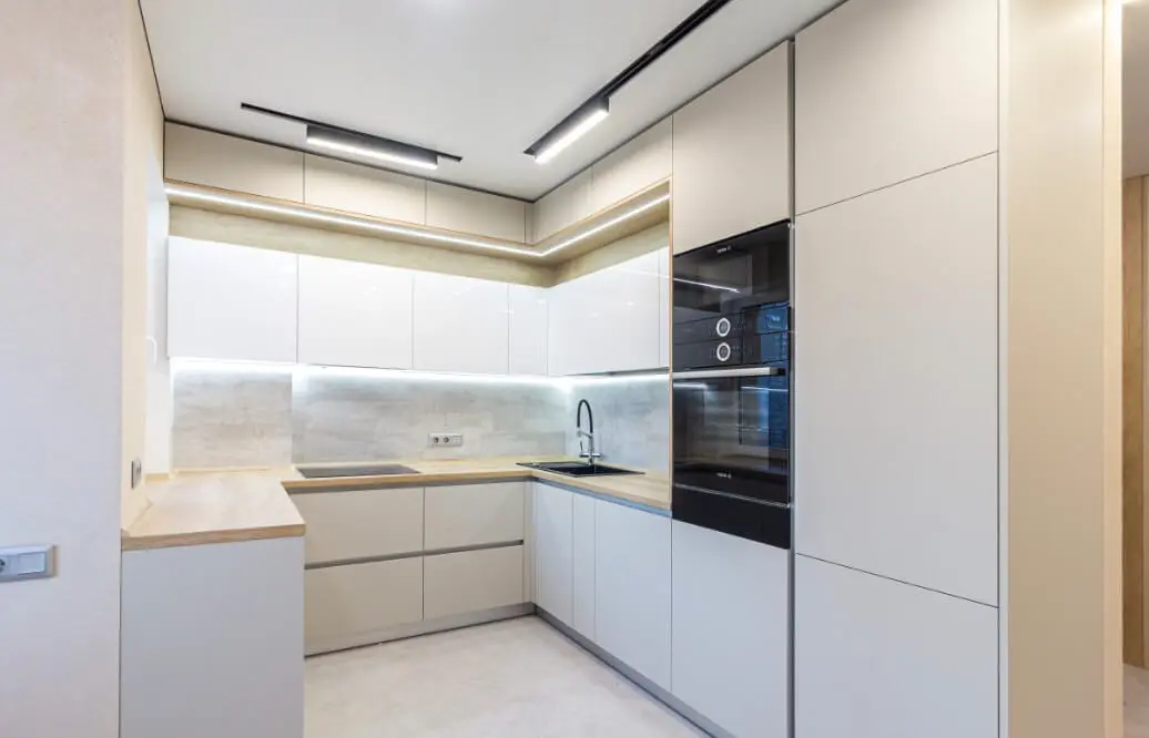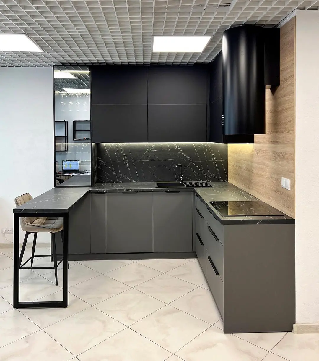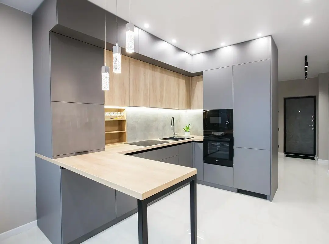 Такая кухня непрерывно следует вдоль трех сторон при помощи столешниц, при таком расположении формируется буква «П». П-образная конструкция напоминает угловые кухни только с большими функциями