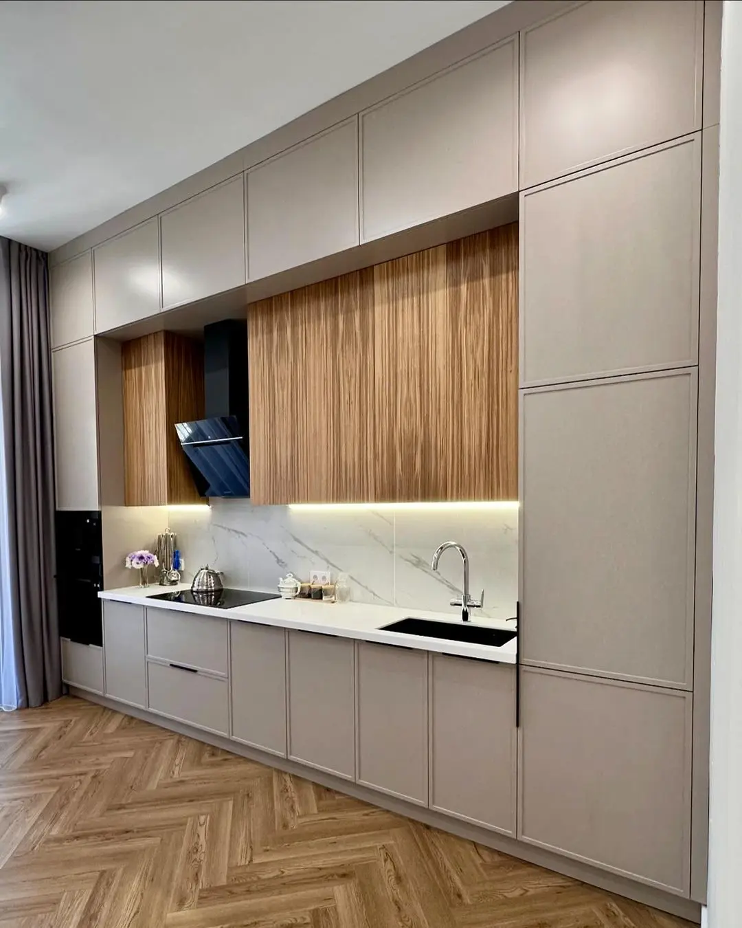 Дизайн прямых кухонь легко проектируется и позволяют правильно размещать рабочее пространство. Они гармонично смотрят в помещениях с непростой геометрией